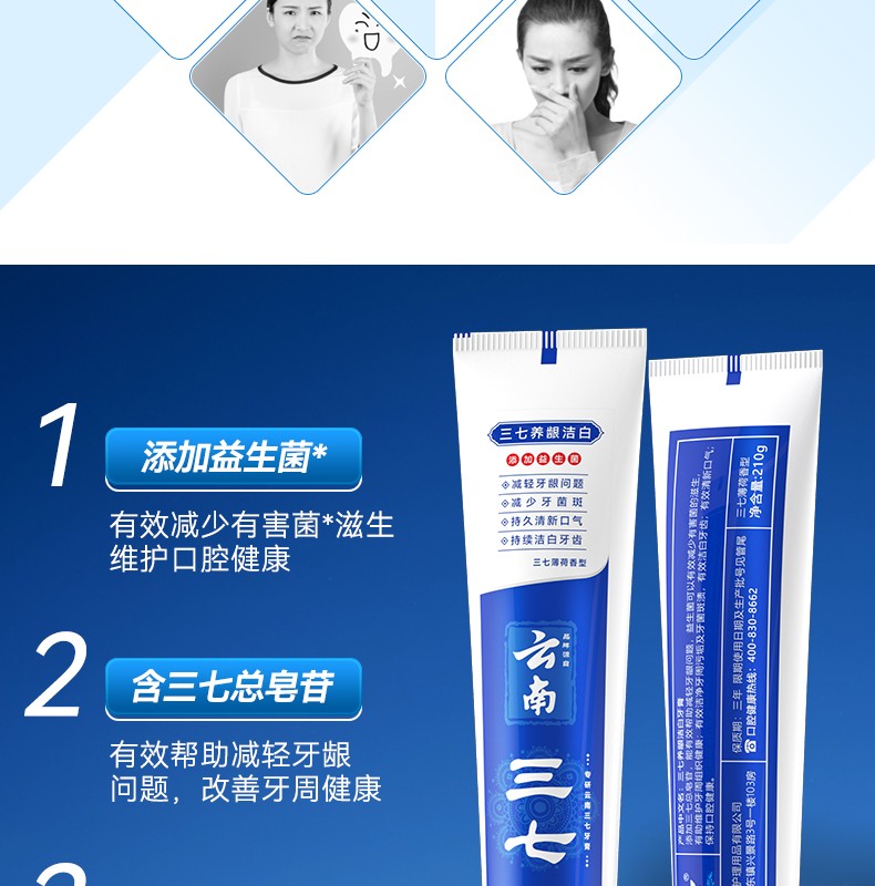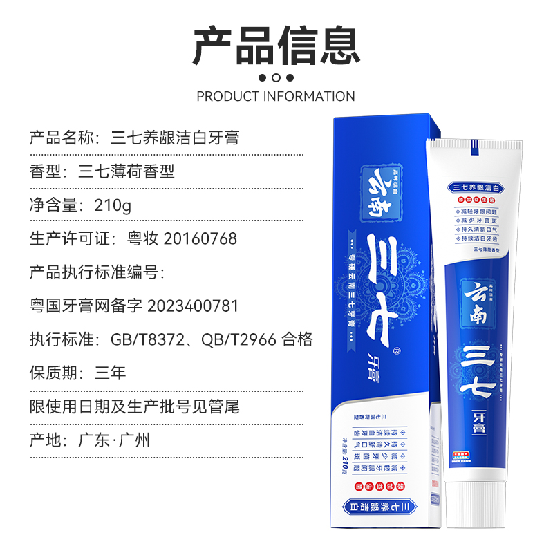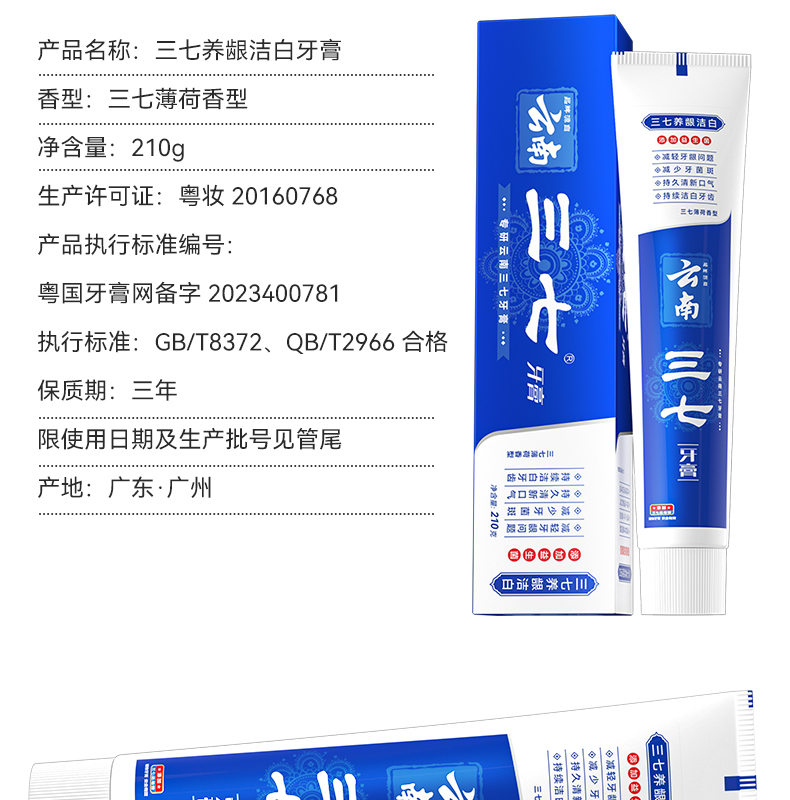商品名称:三七养龈洁白牙膏210g 6970031821094 偏远地区另加运费