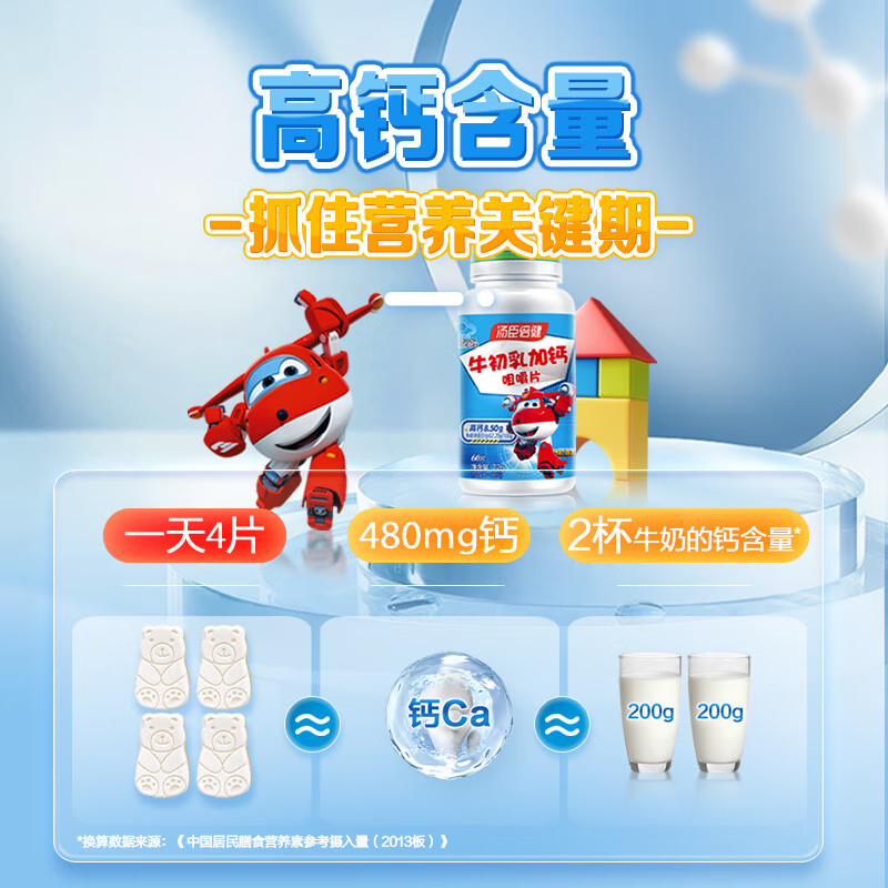 商品名称:汤臣倍健牛初乳加钙咀嚼片优惠装(60片×2瓶)-超级飞侠装 6940863609450 偏远另加运费
