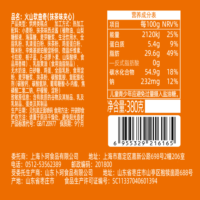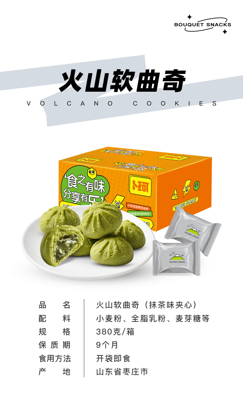 商品名称:卜珂 食乐分享火山软曲奇(抹茶味夹心)380克 6955329216165 偏远另加运费