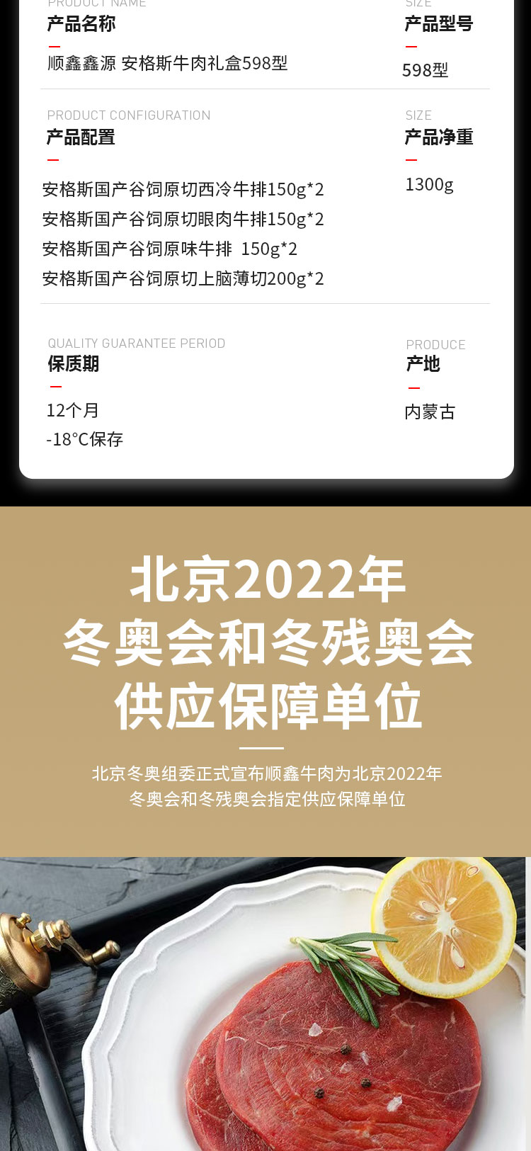 商品名称:顺鑫鑫源安格斯牛肉礼盒 598型 奥运标准 顺鑫牛肉 1300g 6970288083047