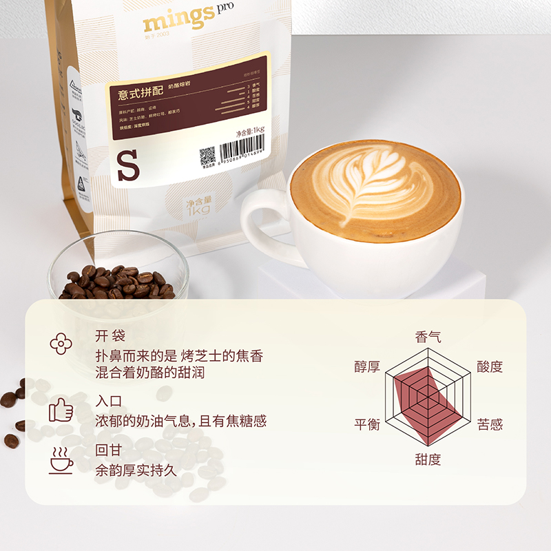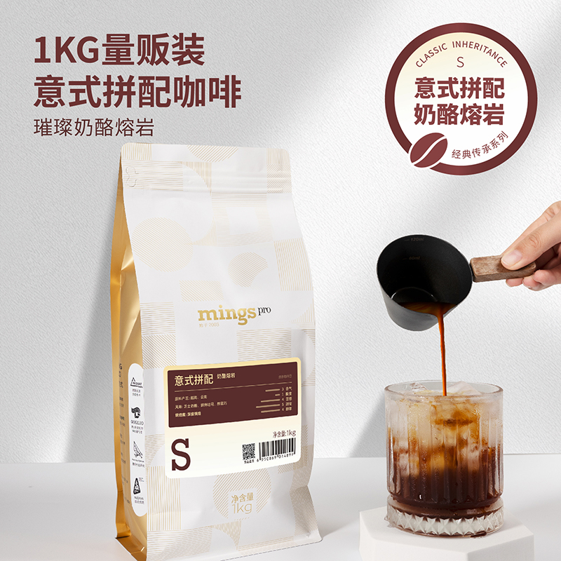 商品名称:铭氏(Ming's)意式拼配咖啡豆1kg 深烘豆顺滑香醇