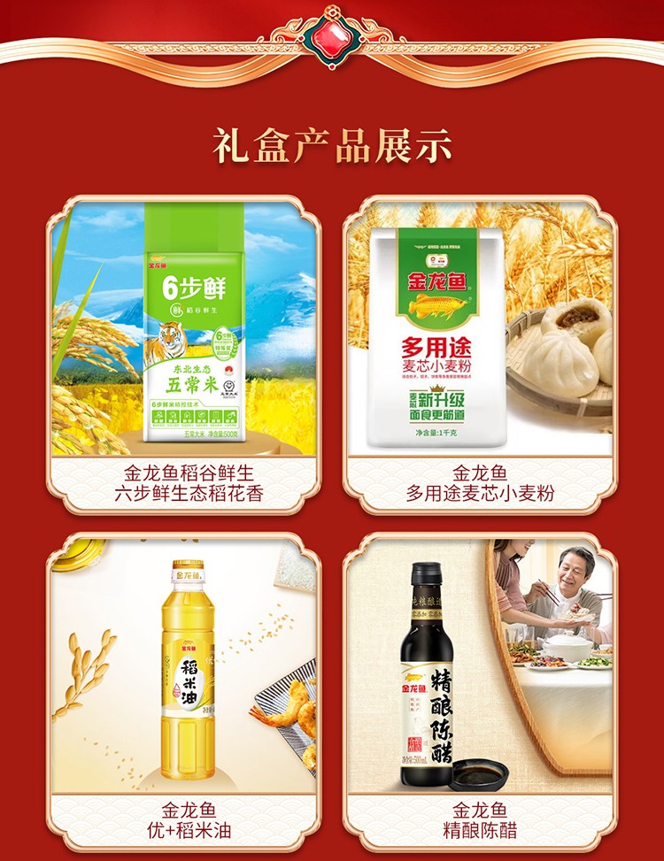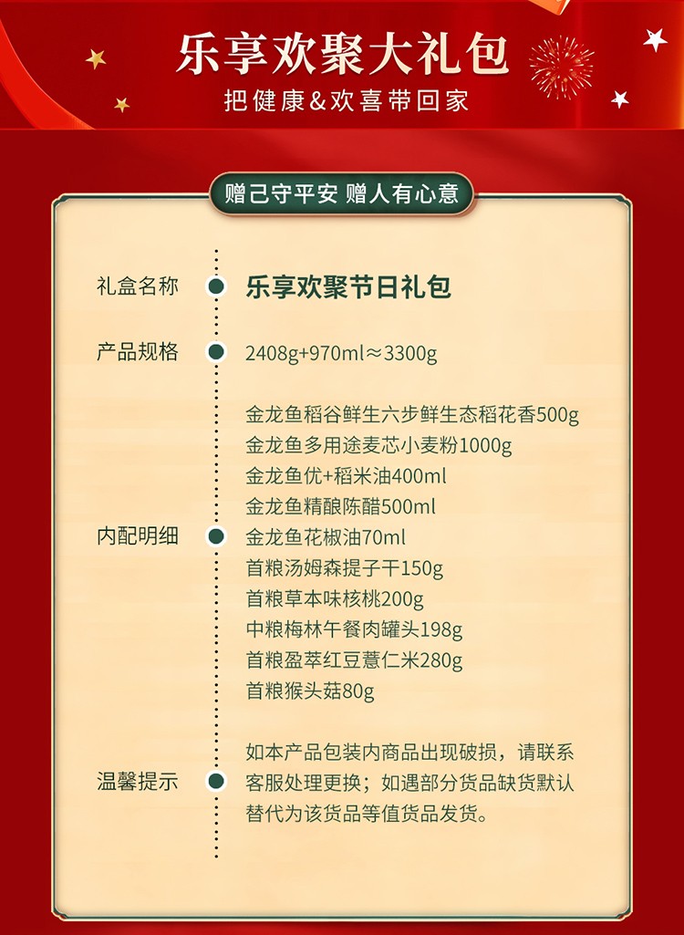 商品名称:首粮乐享欢聚春节大礼包大米调料食用油小麦粉杂粮干菌干果组合3300g