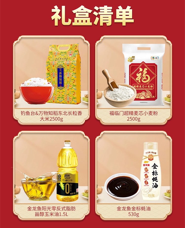 商品名称:首粮春节大礼包福利A款 大米小麦粉玉米油耗油粮油组合 5530g+1500ml