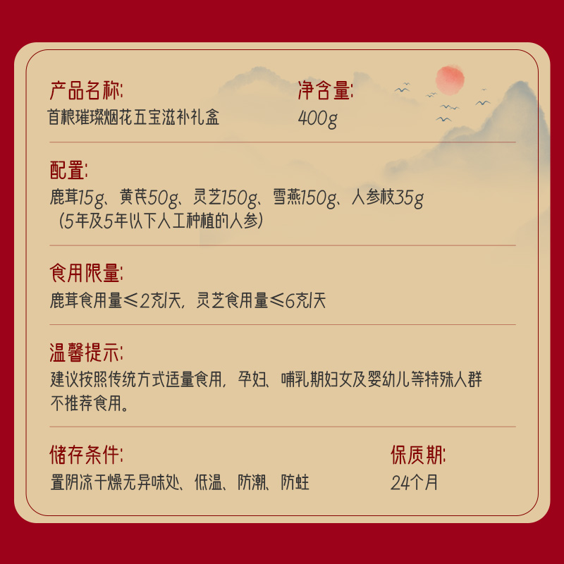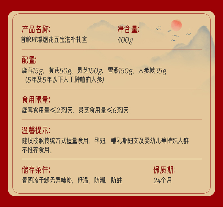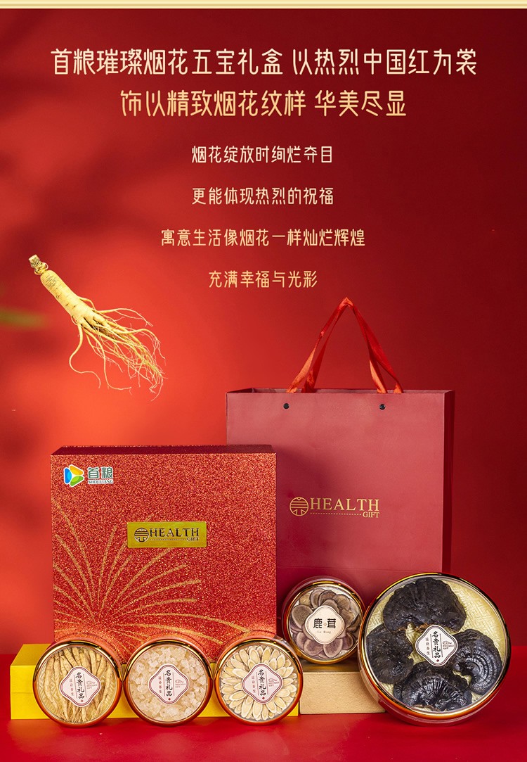 商品名称:首粮鹿茸黄芪灵芝人参雪燕物华天珍五拼 400g 6970740748279