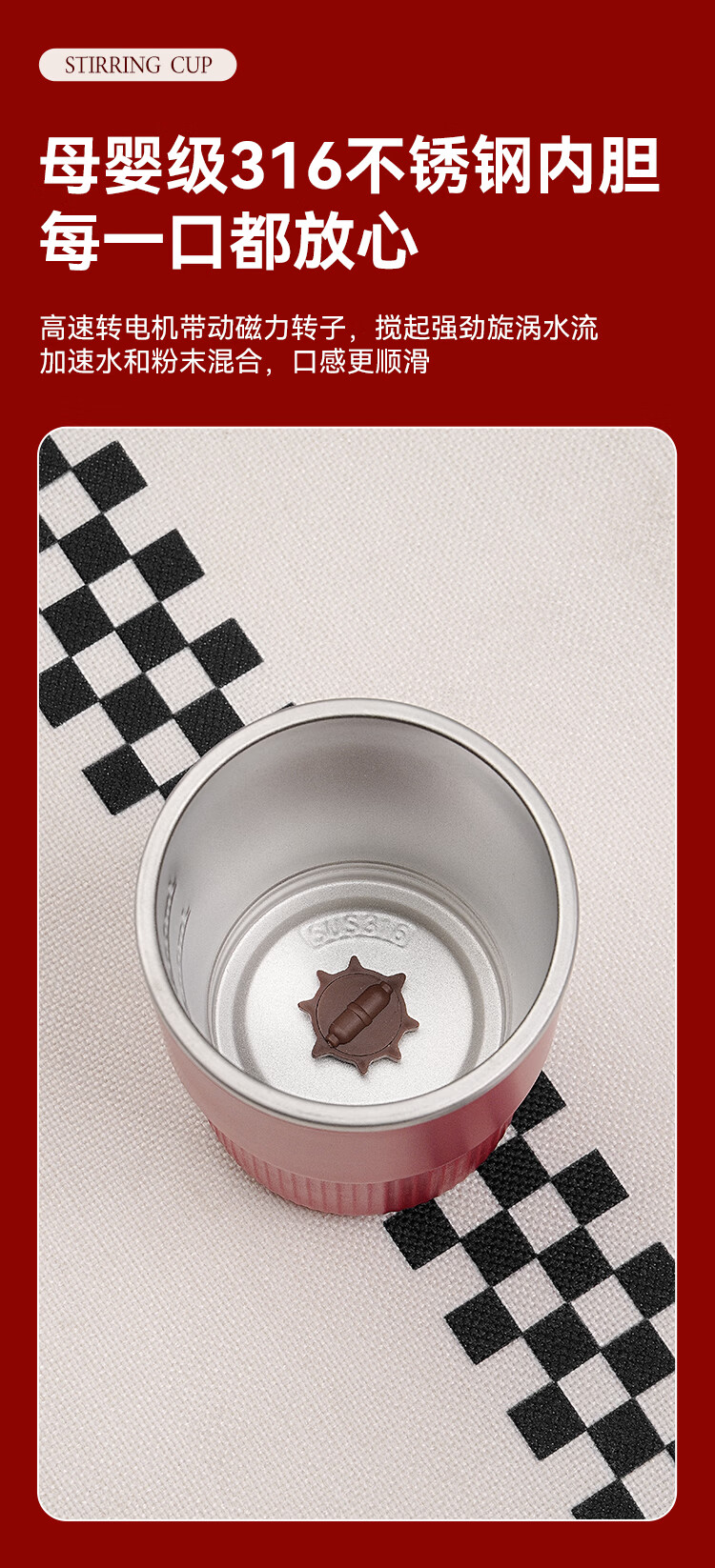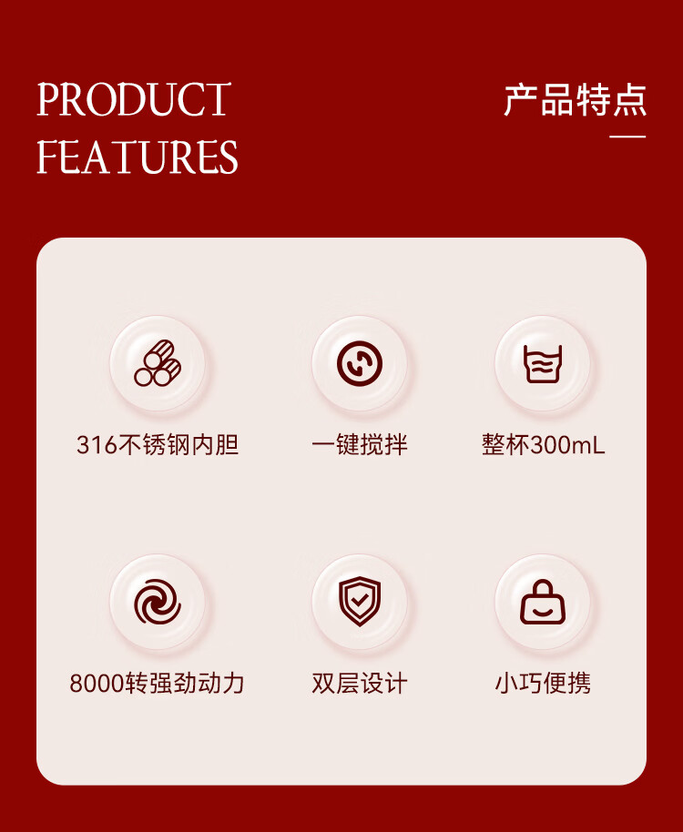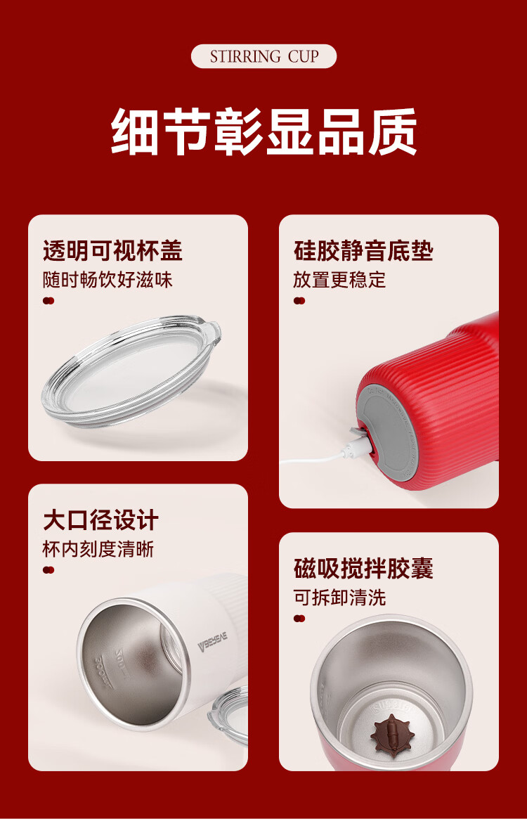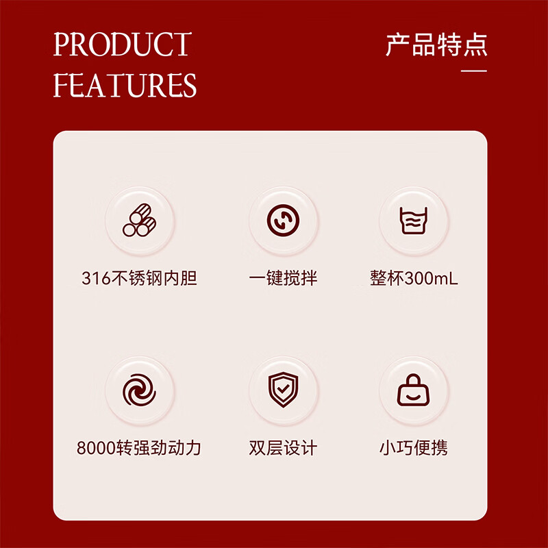 316不锈钢内胆,入口更安心 一键启动搅拌功能,口感顺滑,均匀不结块 贴心电量显示+温度显示,轻松应对各种场景