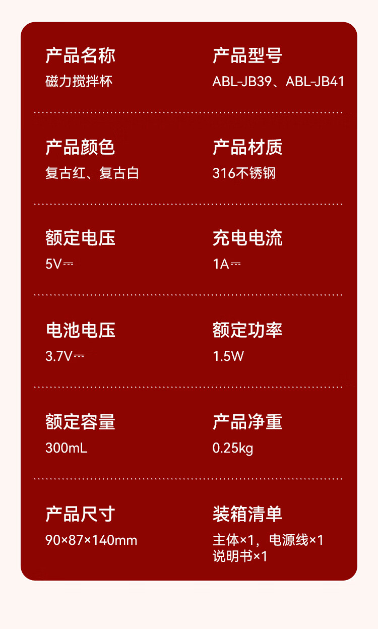 商品名称:艾贝丽电动搅拌杯ABL-JB39 红色 6972149935229 偏远地区需额外加运费