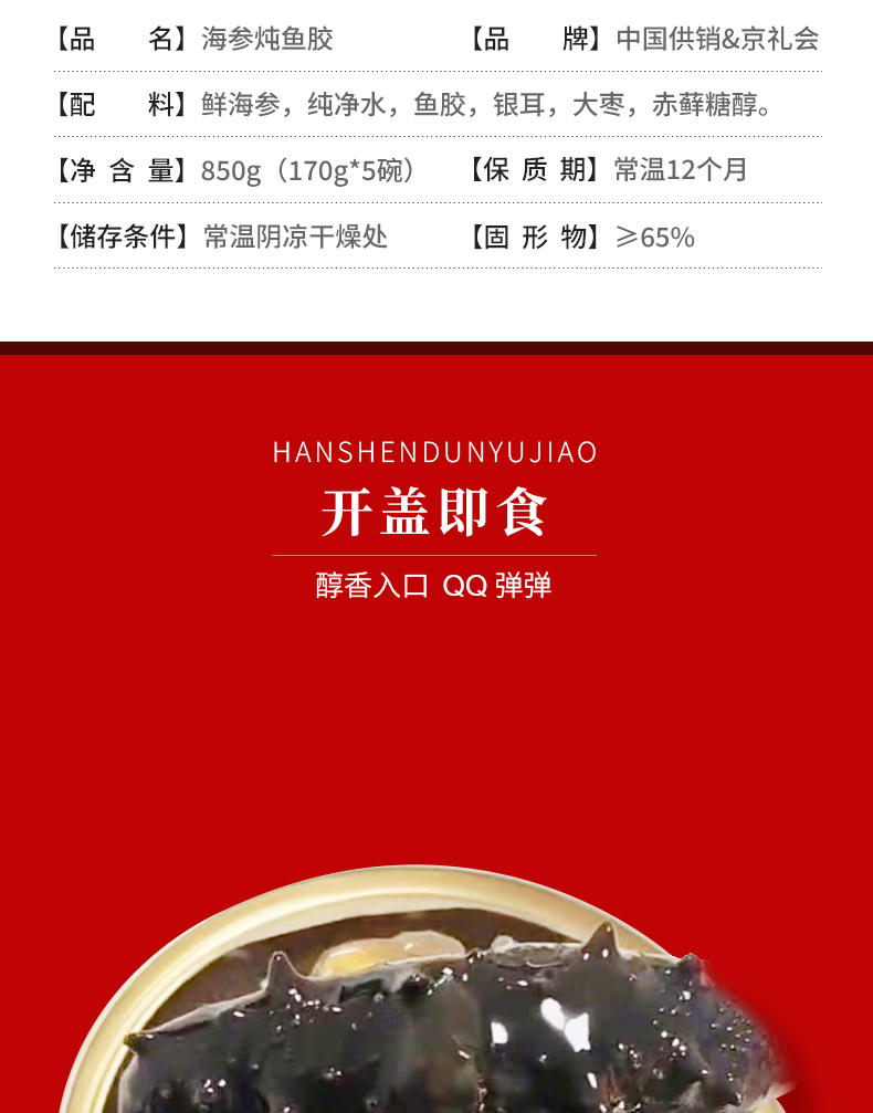 商品名称:首粮中国供销&京礼会-海参炖鱼胶850g 6976389952497