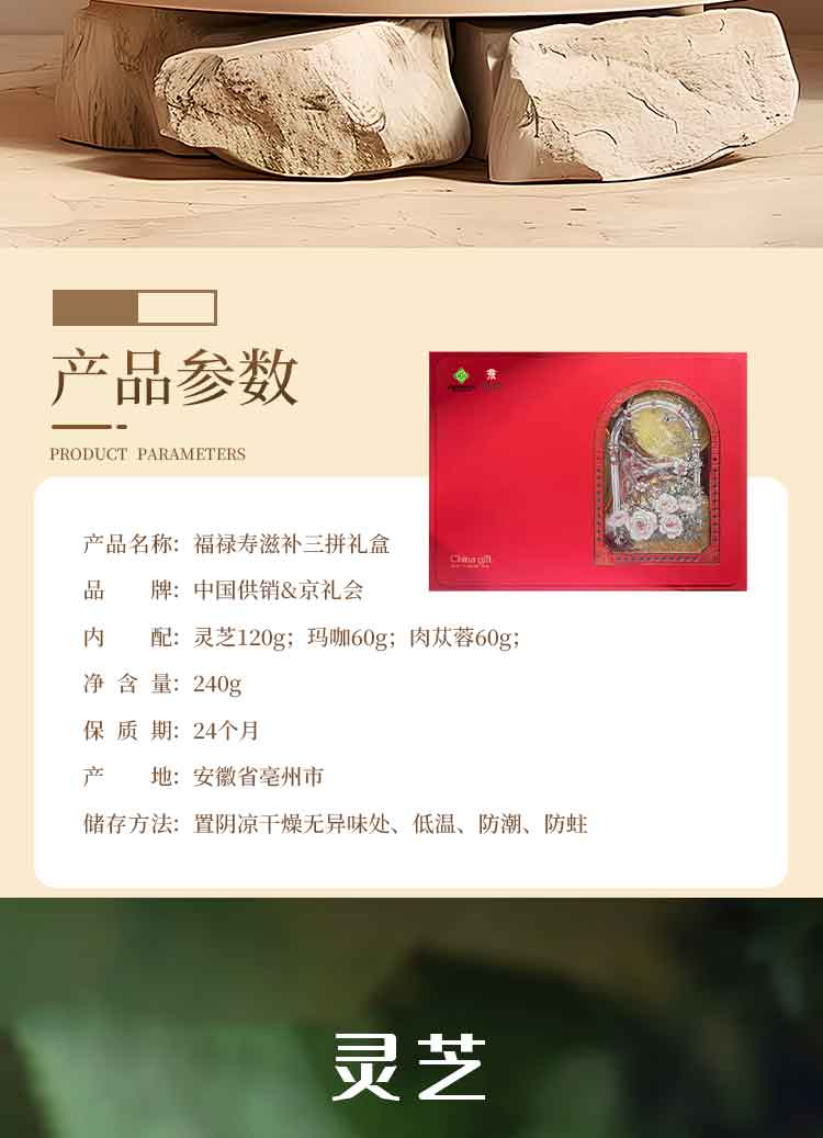 商品名称:首粮中国供销&京礼会--福禄寿三拼礼盒灵芝120g玛咖60g肉苁蓉60g 6976389953371