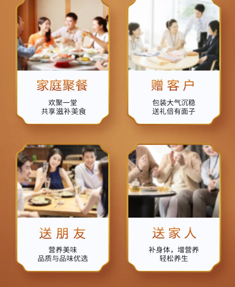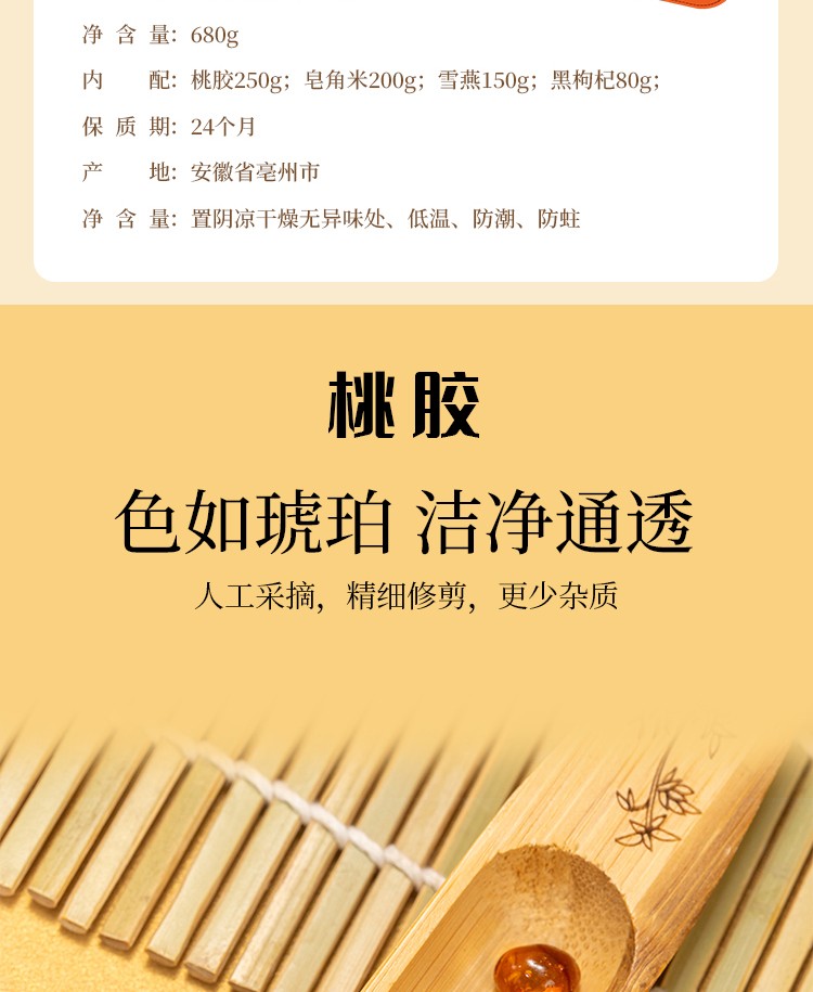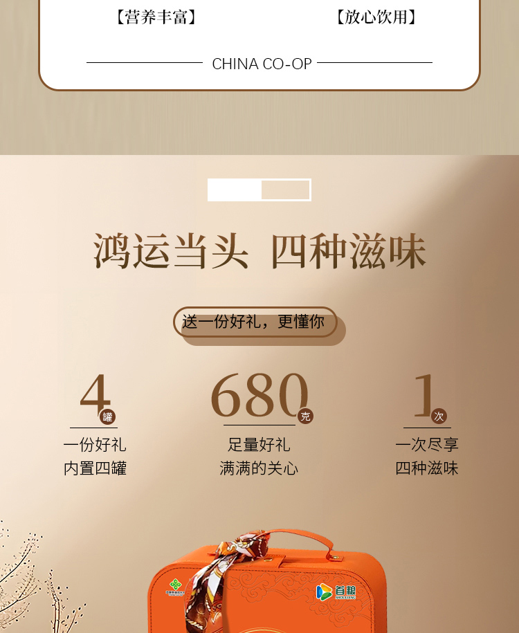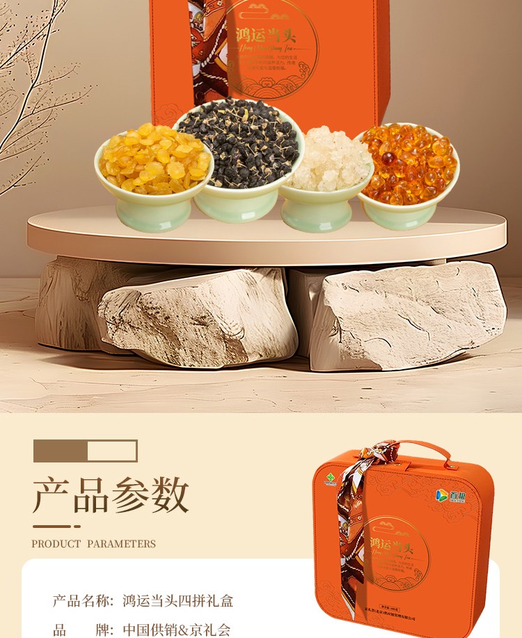 商品名称:首粮中国供销&京礼会--鸿运当头四拼礼盒680g桃胶雪燕皂角米黑枸杞 6976389951759