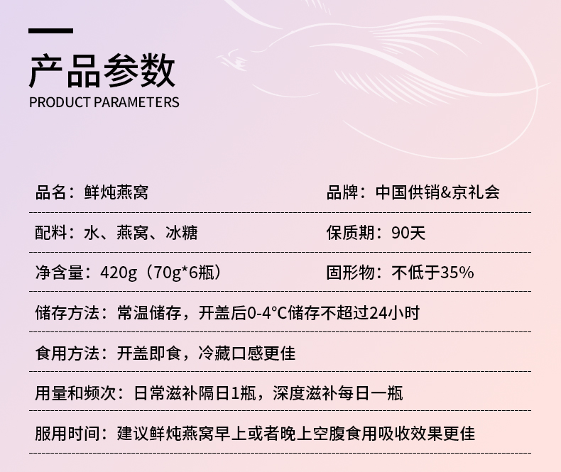 商品名称:首粮中国供销&京礼会--鲜炖燕窝A款70g*6 6976389952534