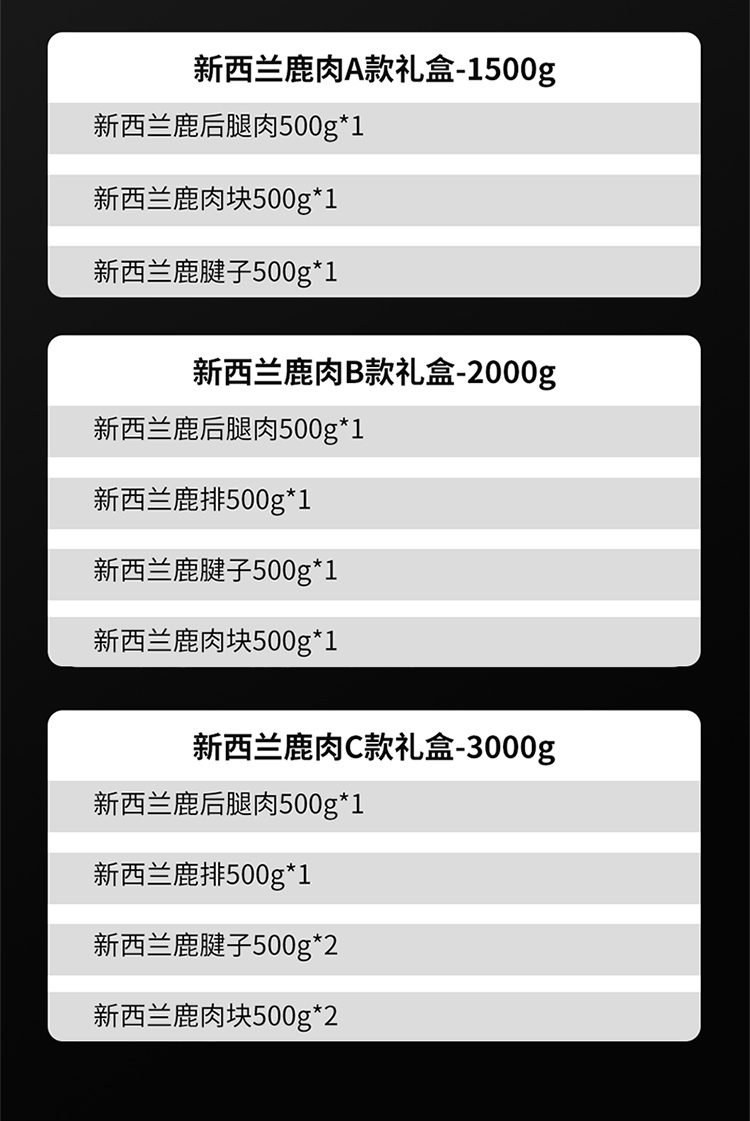 商品名称:首粮新西兰鹿肉B款礼盒2000g 6976389951728