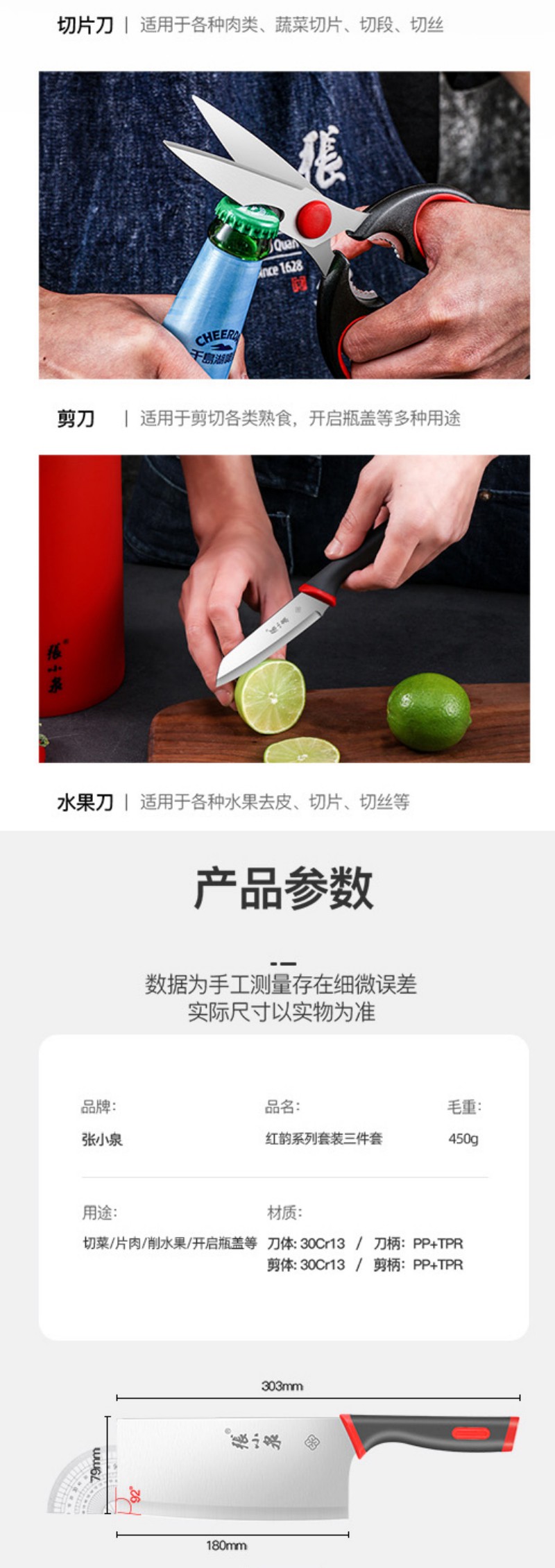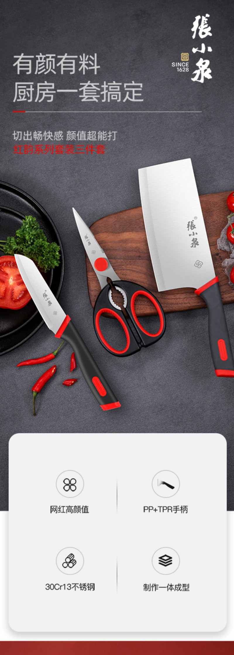 张小泉红韵系列刀具套装菜刀水果刀剪刀三件套 D400061 6957389146864 偏远另加运费