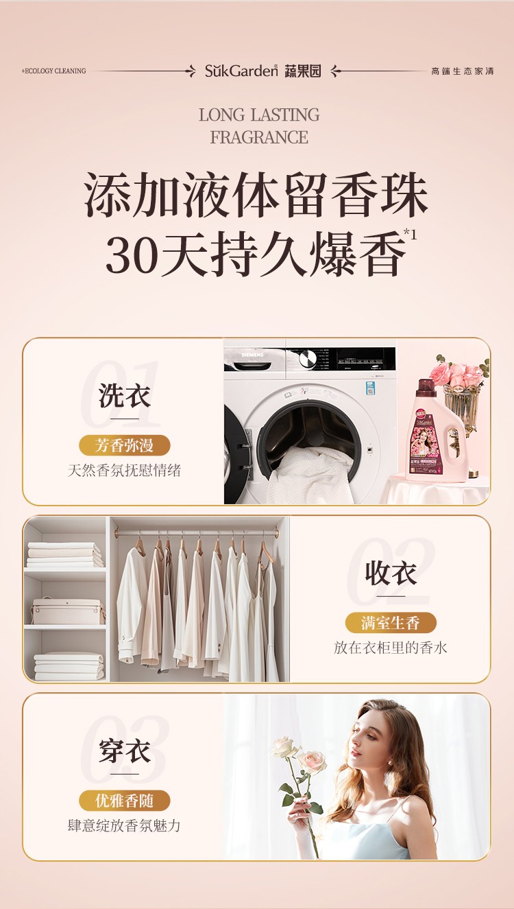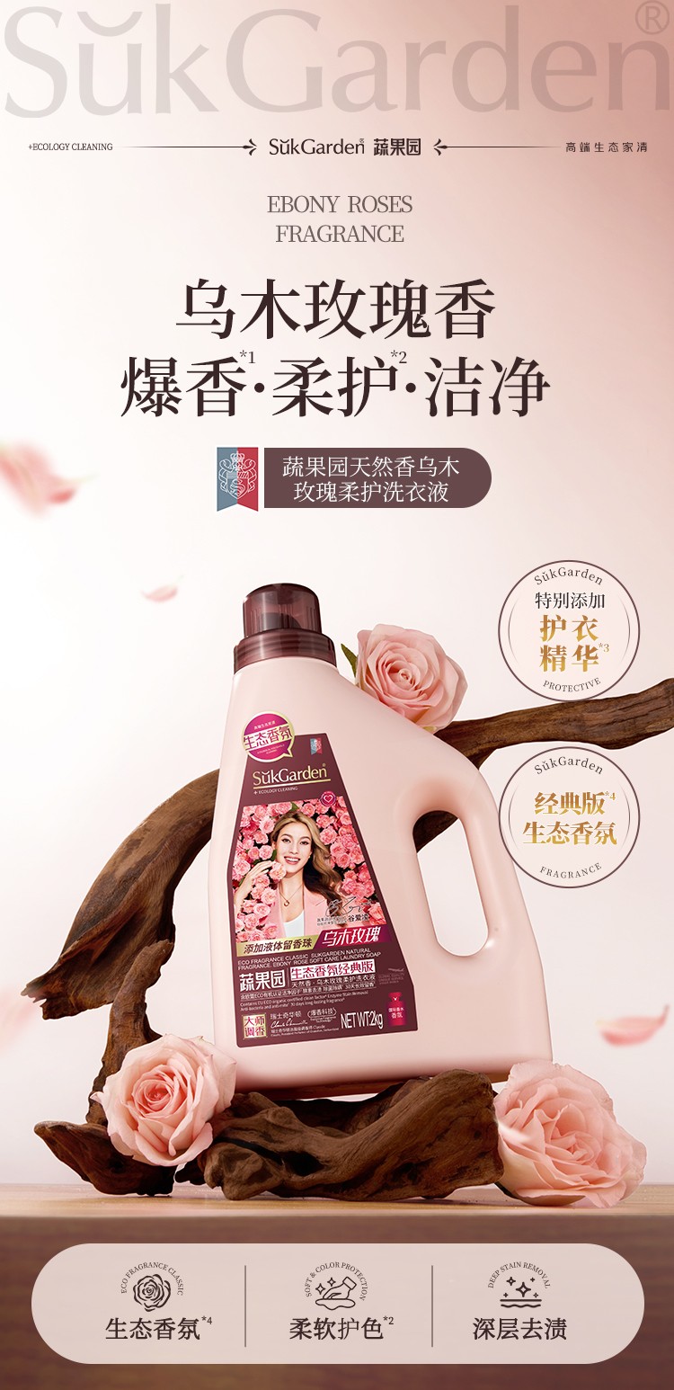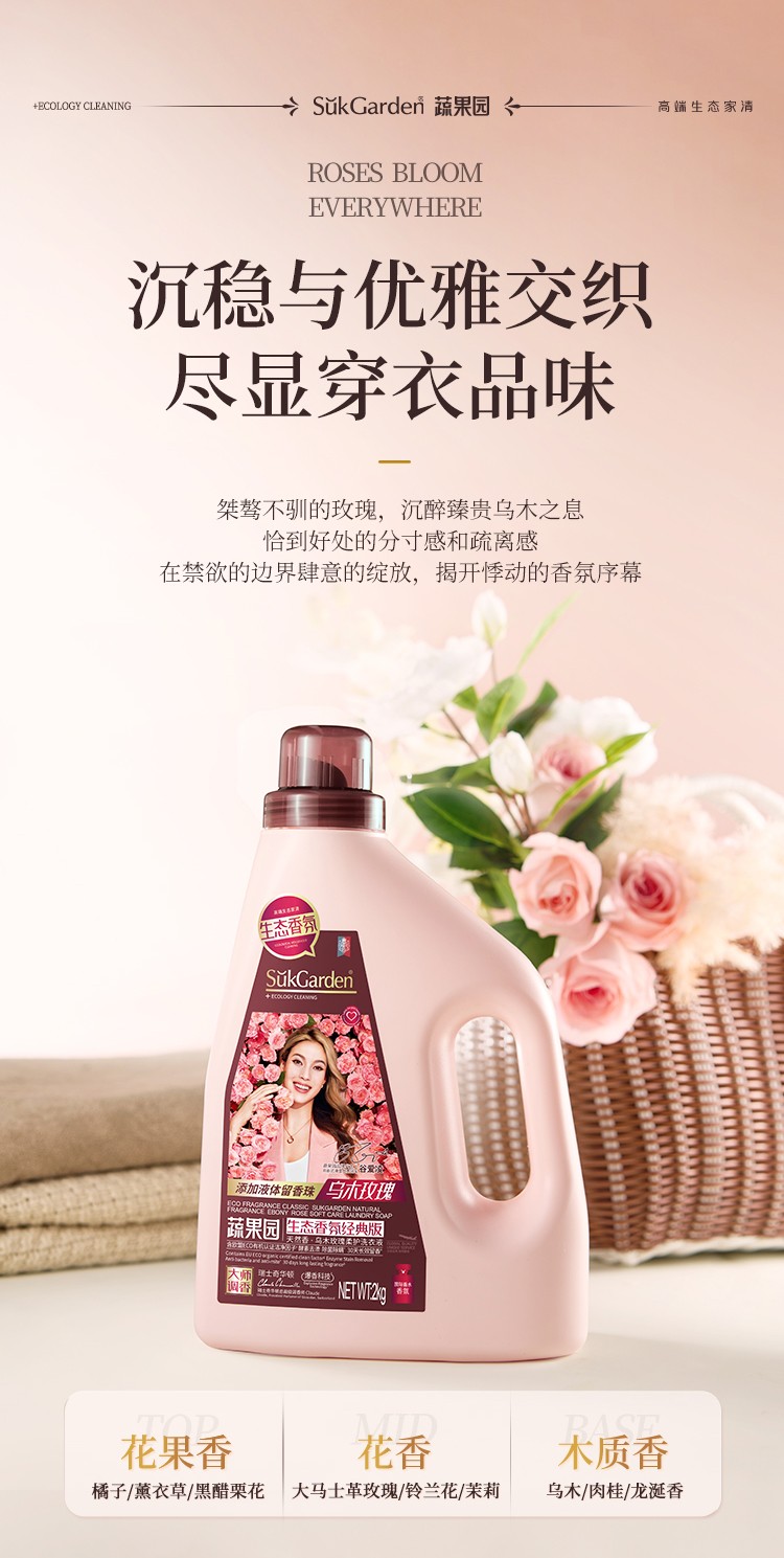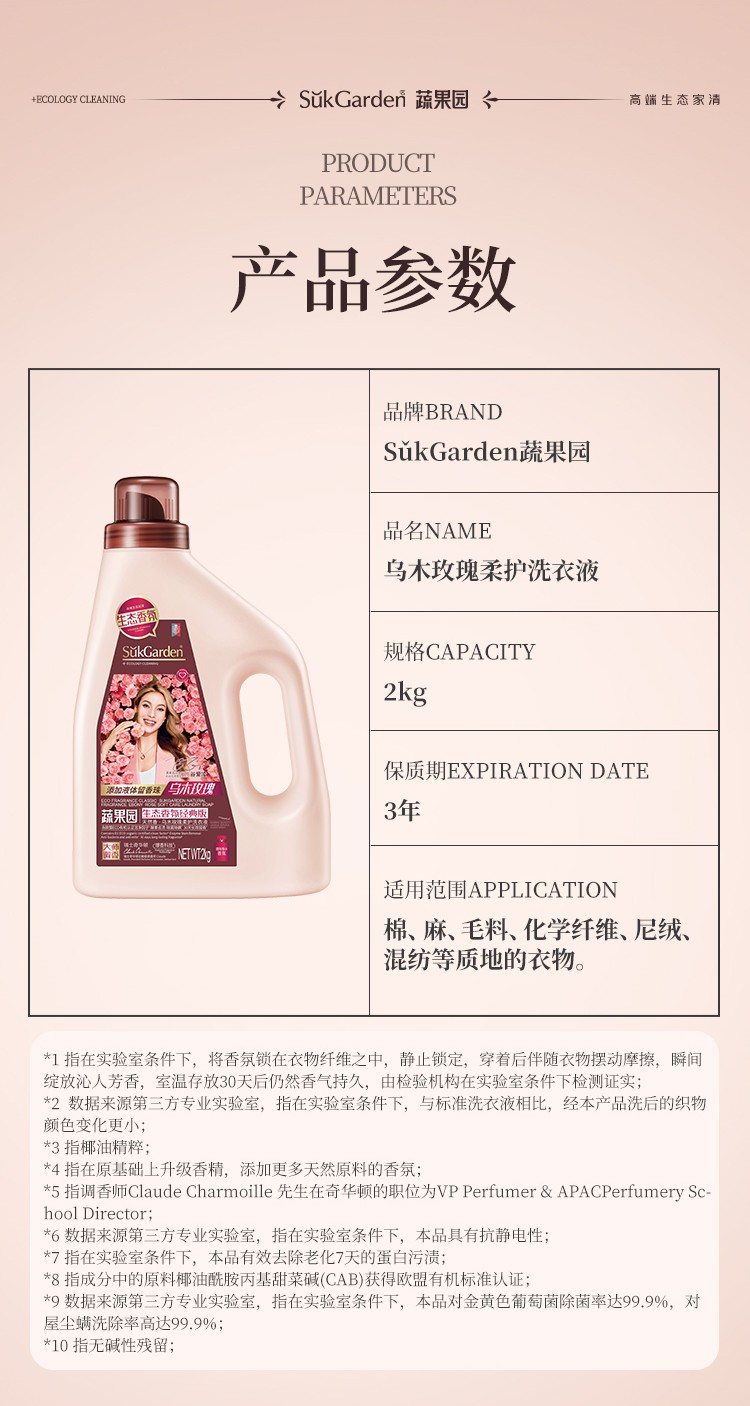 商品名称:SukGarden蔬果园天然香乌木玫瑰柔护洗衣液2kgSGY0666
