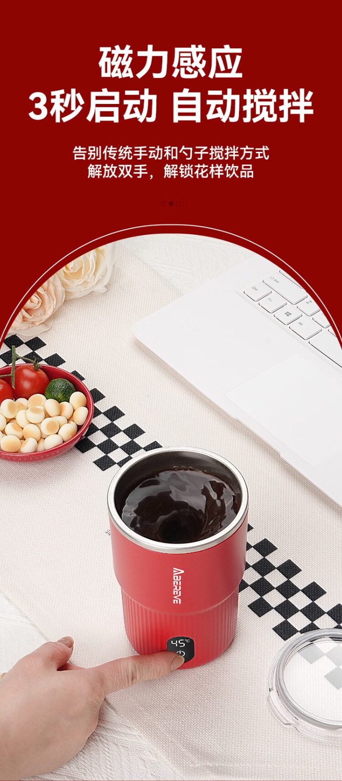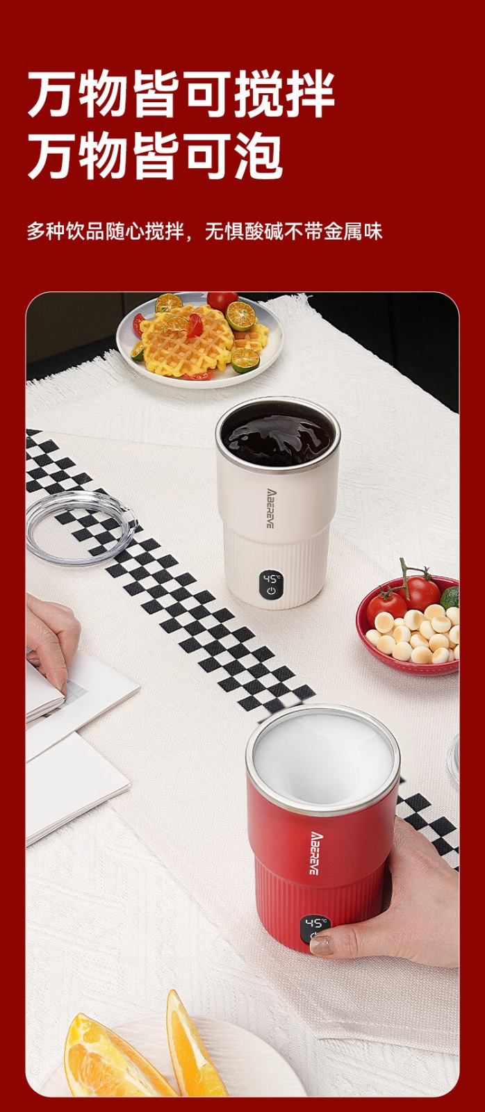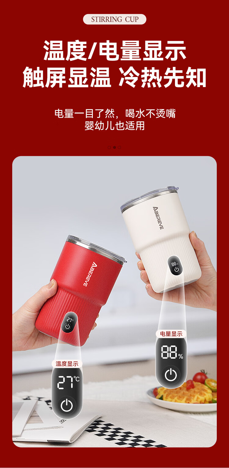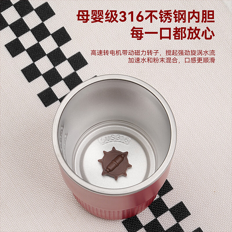 \"316不锈钢内胆,入口更安心 一键启动搅拌功能,口感顺滑,均匀不结块 贴心电量显示+温度显示,轻松应对各种场景