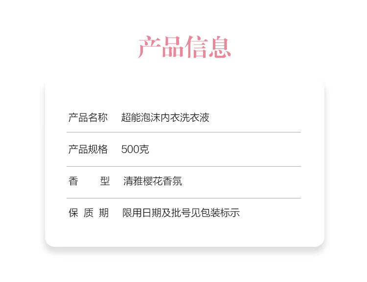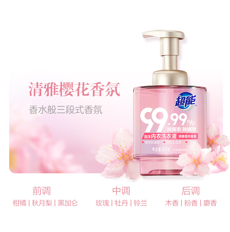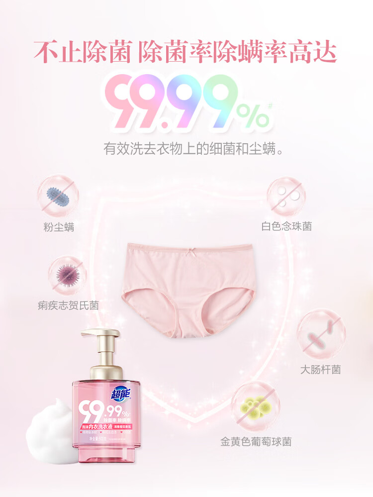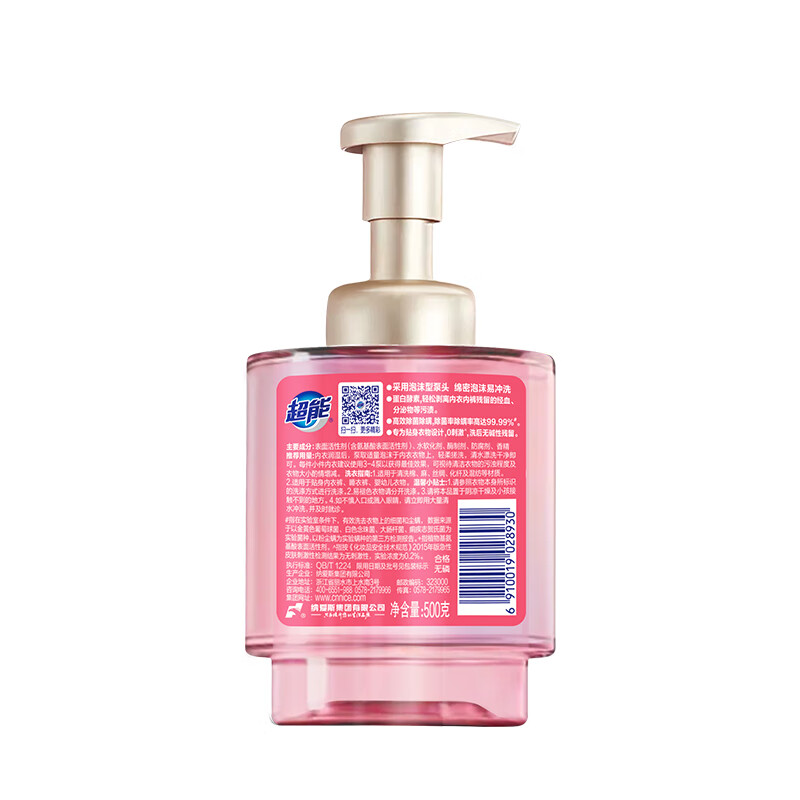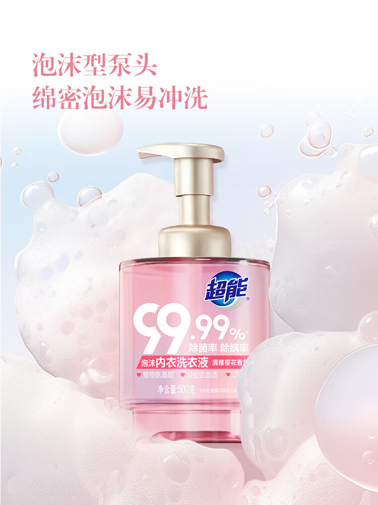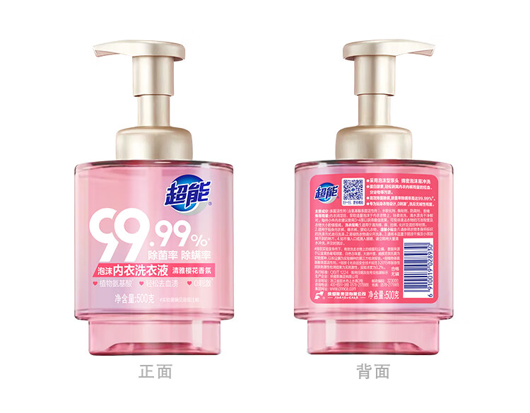 商品名称:超能 泡沫内衣洗衣液 1斤(500g) 轻松去血渍 99.99%除菌除螨 0刺激 6910019028930