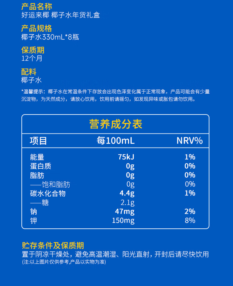 商品名称:可可满分椰子水330ml*8瓶 电解质水 饮料低糖低卡零脂 6974139943290