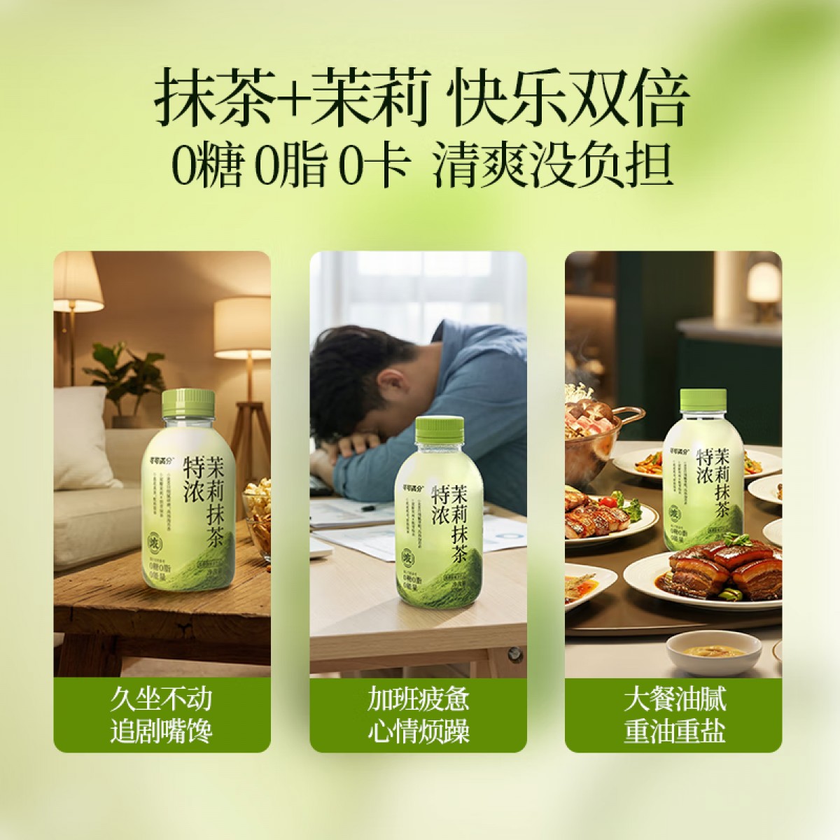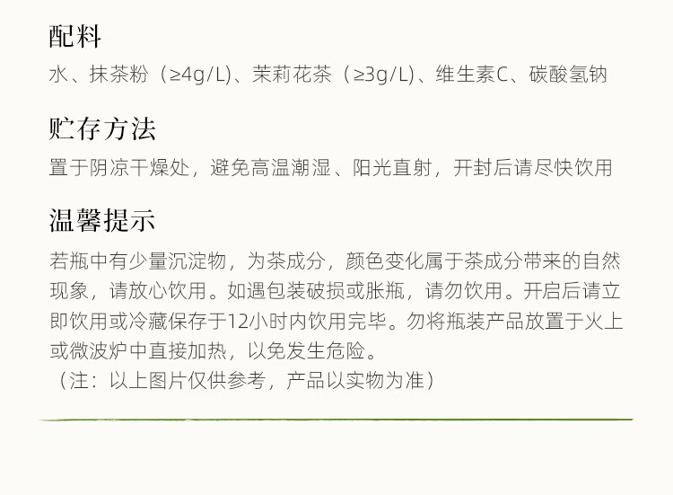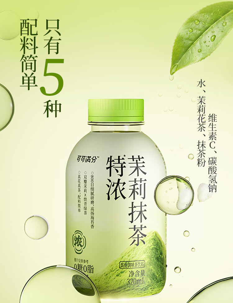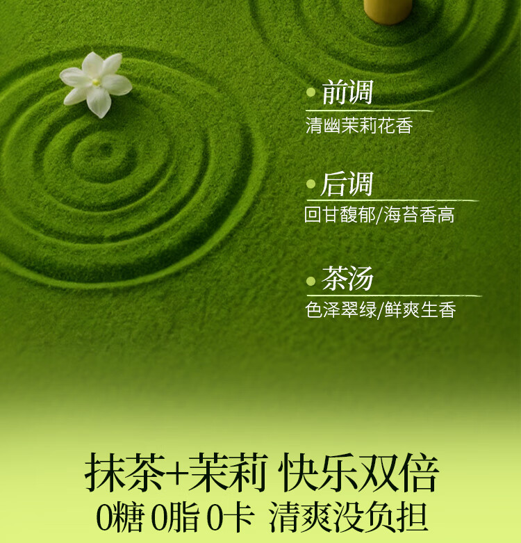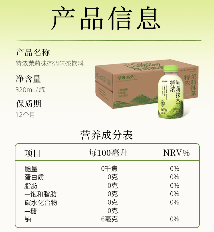 商品名称:可可满分特浓茉莉抹茶无糖饮料0脂0卡真花真茶配料简单 特浓茉莉抹茶320ml*6瓶 ZH2025120501