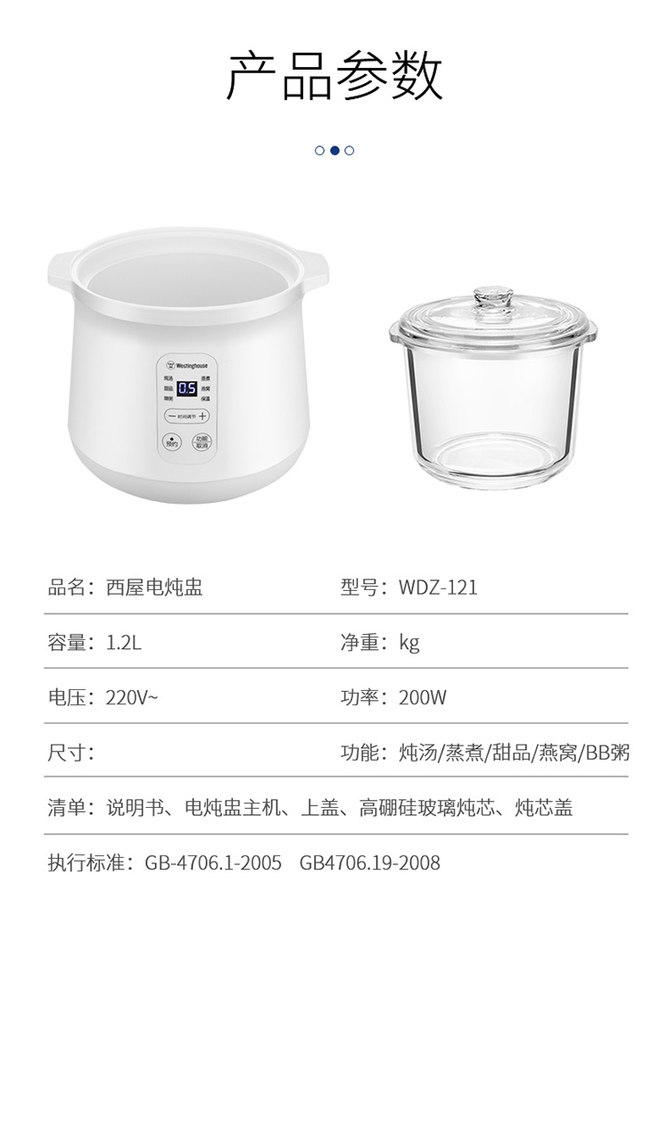 商品名称:西屋Westinghouse 电炖锅 燕窝炖盅 隔水炖家用全自动煲汤锅电炖盅WDZ-121 6939371302649新疆西藏不发货