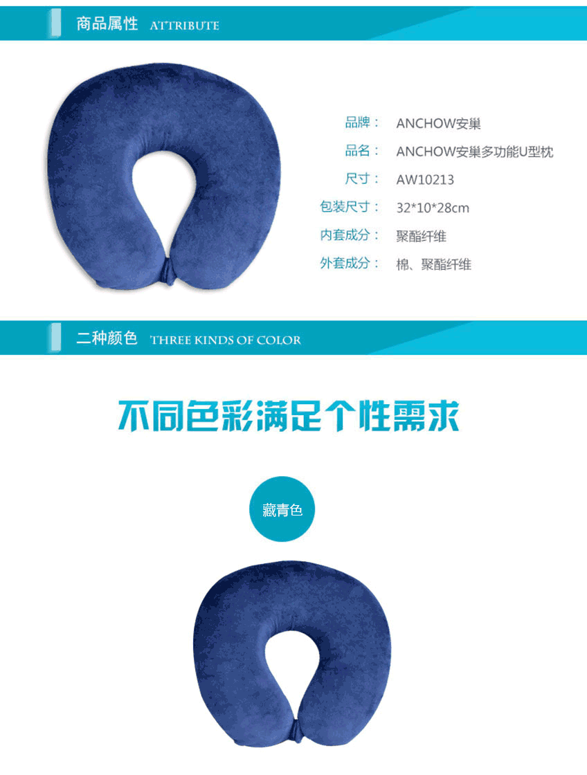 商品名称:安巢家居 U型枕头枕芯多功能记忆棉护颈旅行枕午睡枕颈枕办公室头枕靠枕靠垫 藏青色AW10213