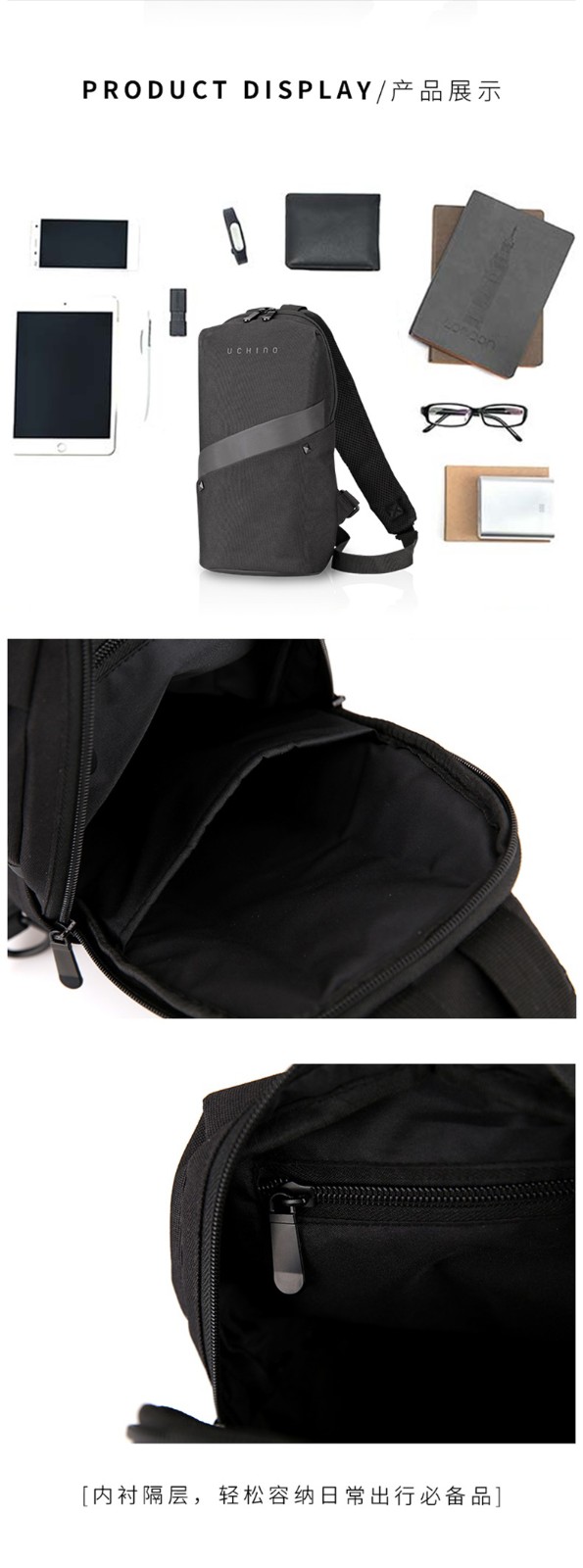 商品名称:内野小棉袄胸包男士胸包休闲男包潮流单肩斜挎包 黑色