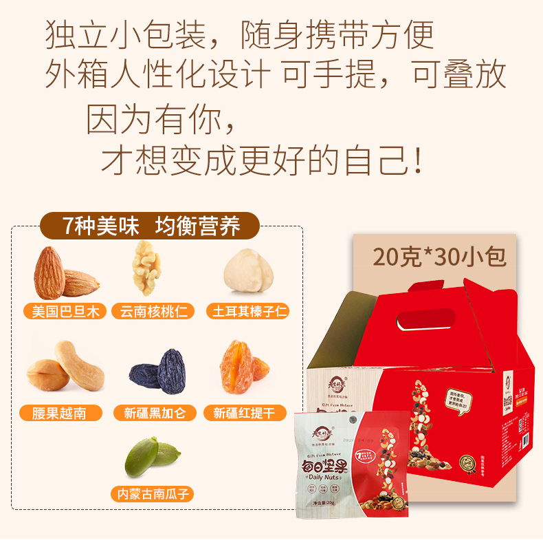 天生好果 坚果礼盒 每日坚果混合坚果仁 30袋 零食礼盒装 每日坚果B畅销款600克(7种配料)6957292902137