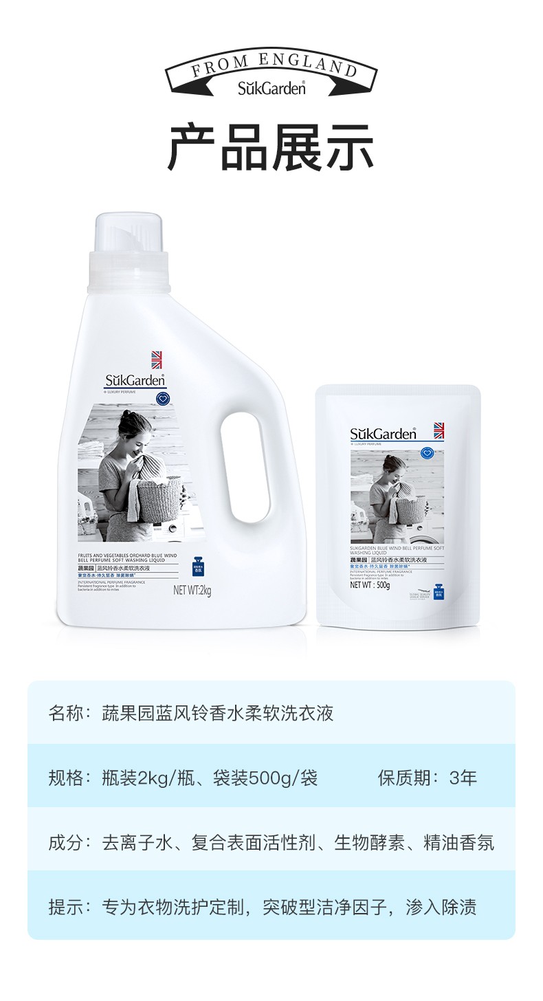 商品名称:SukGarden蔬果园 蓝风铃香水柔软洗衣液 持久留香型 1瓶*2kg 6970470331130 偏远另加运费