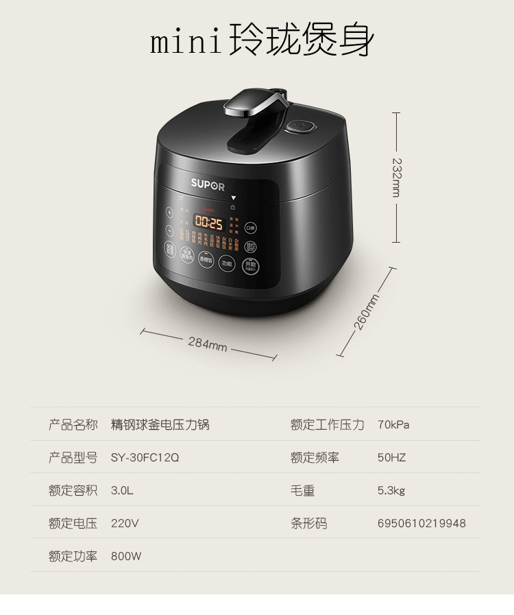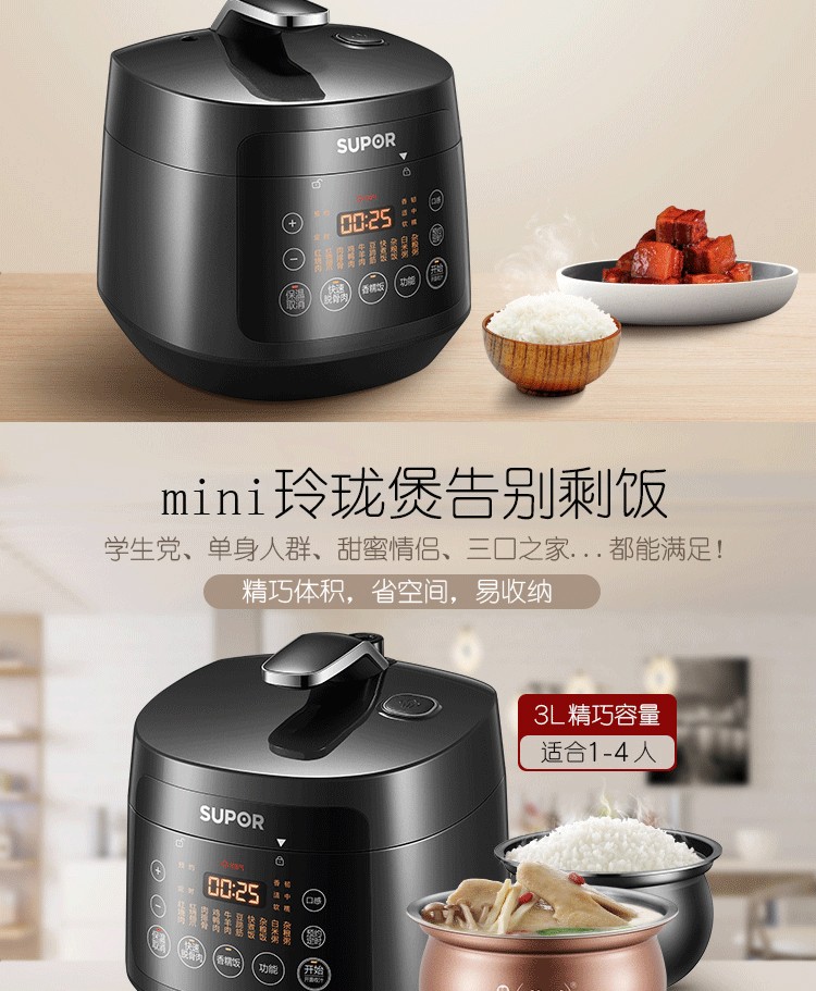 商品名称:苏泊尔 3L智能 精钢球釜内胆 电压力锅 SY-30FC12Q 6950610219948 新疆西藏内蒙宁夏青海不发货