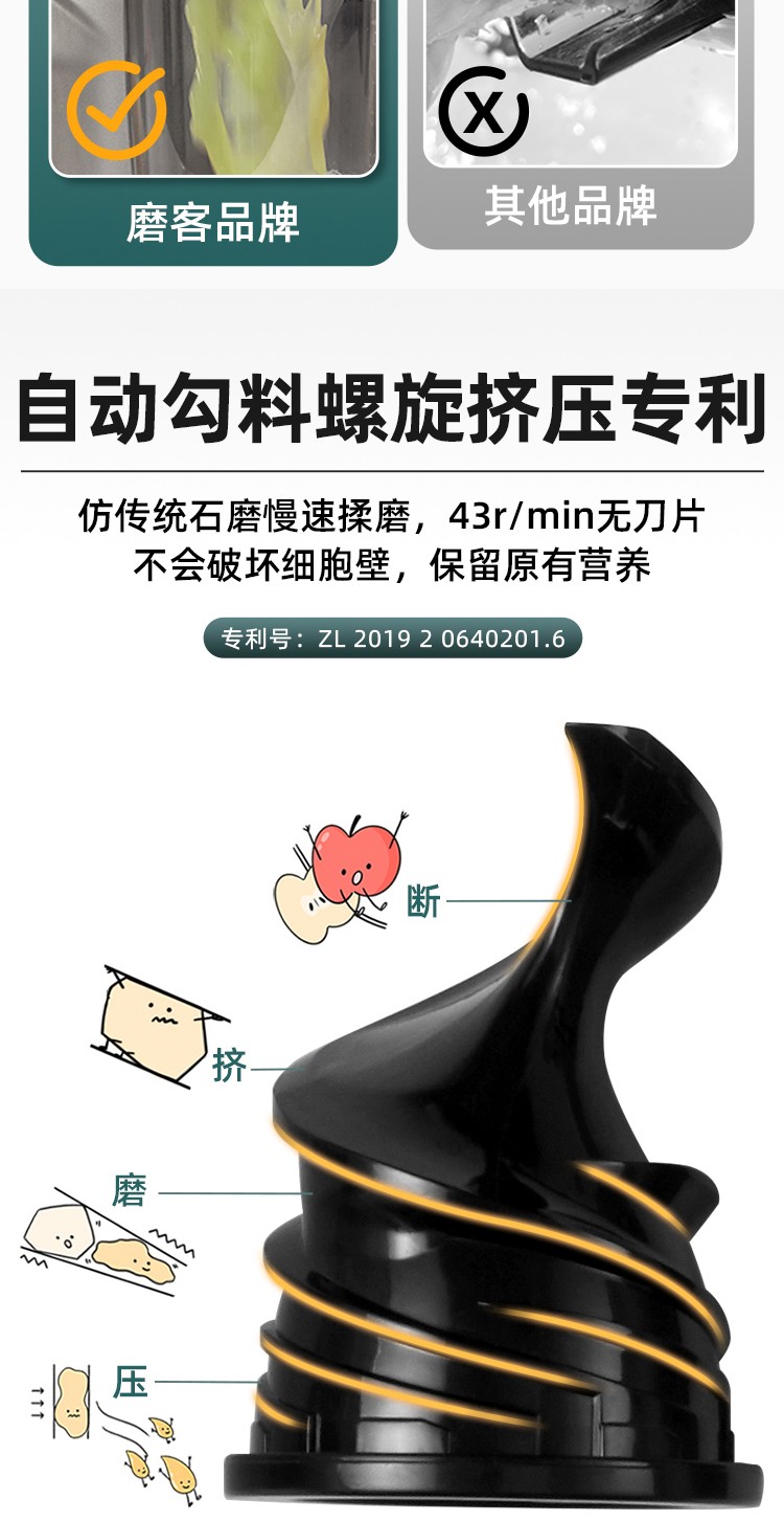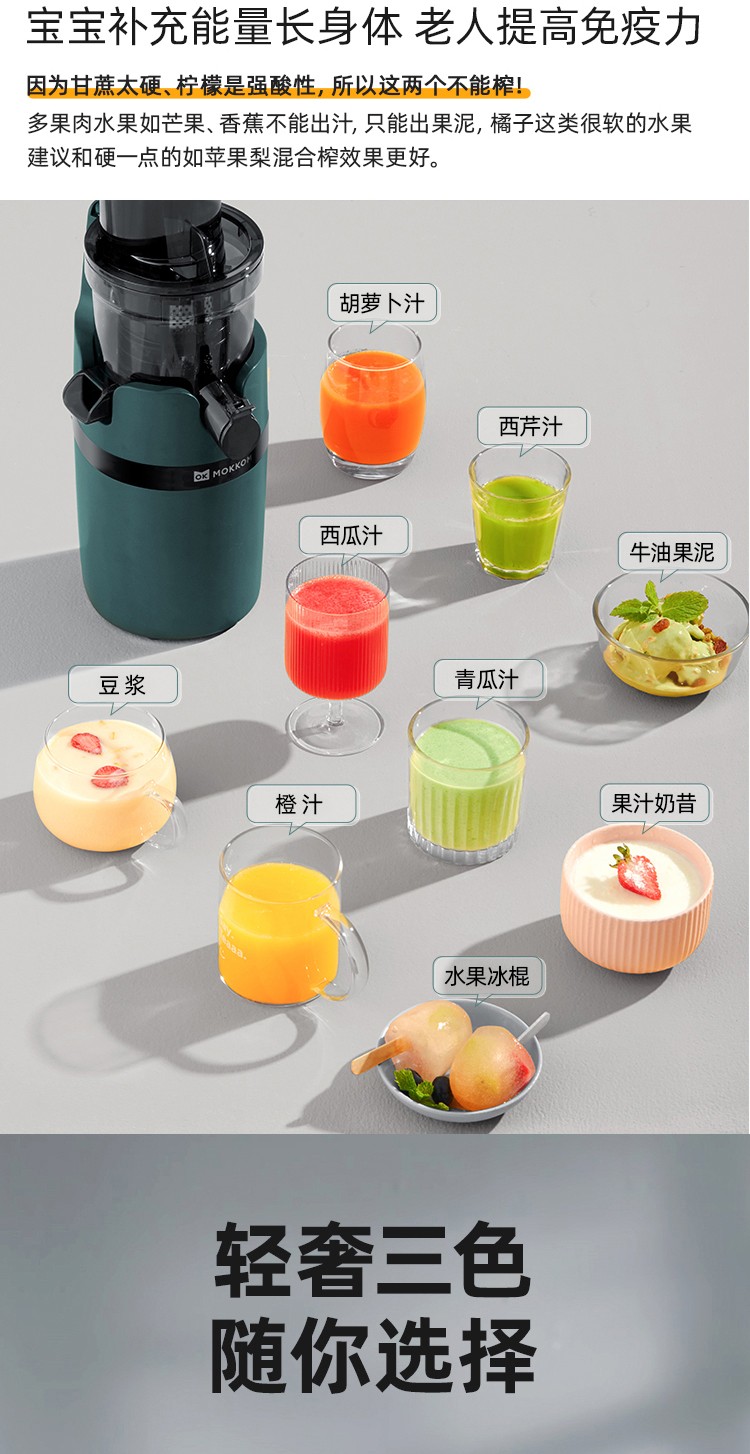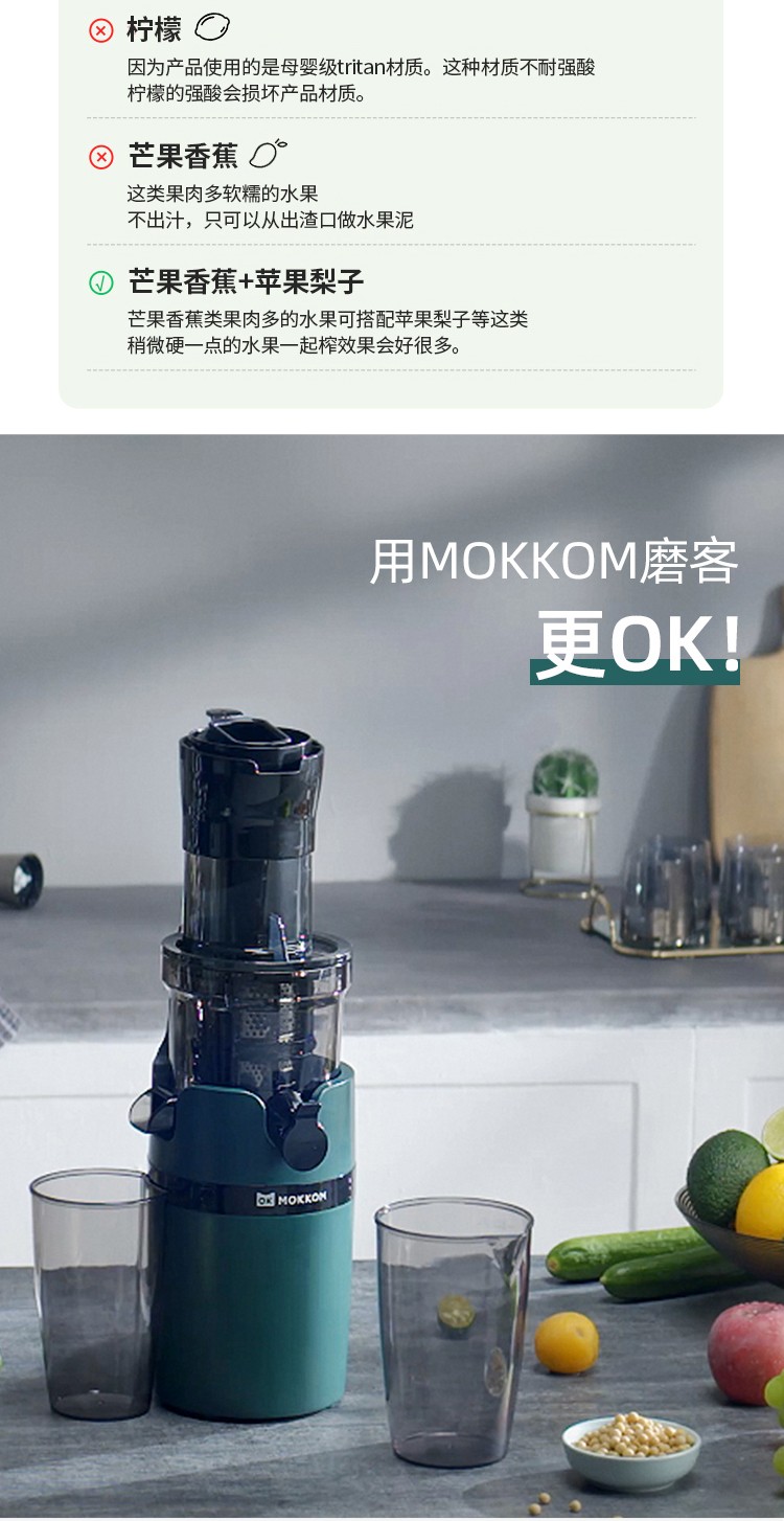 商品名称:mokkom磨客 大口径原汁机 MK-199 榨汁机家用果汁机 墨绿色 6973742960328 偏远不发货