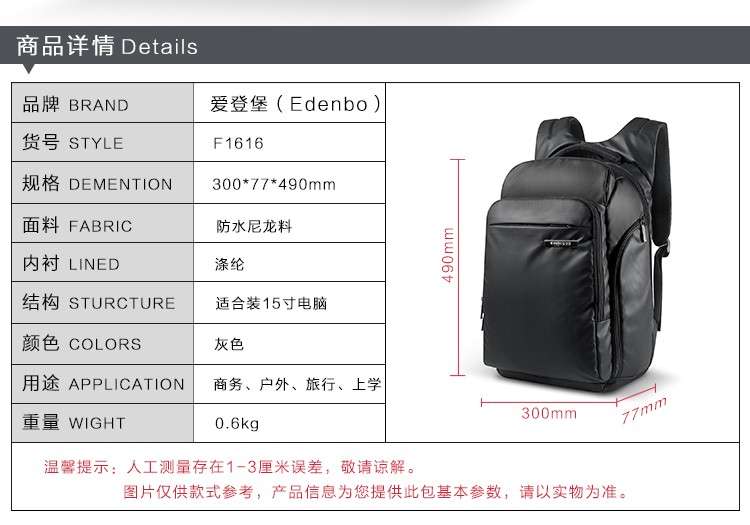 商品名称:爱登堡(Edenbo)商务休闲双肩包F1722黑色