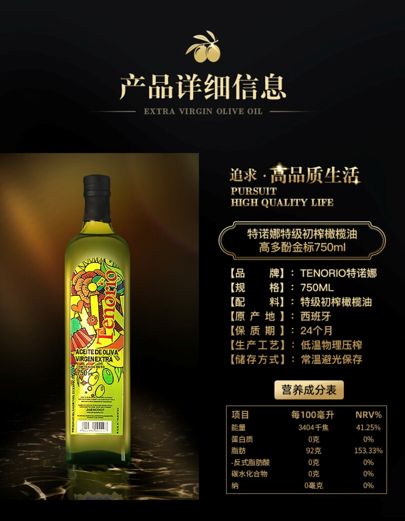 商品名称:特诺娜 1000ml 金标特级初榨橄榄油(高多酚款)8422881000184(新疆,西藏,内蒙,青海,甘肃,宁夏不包邮)