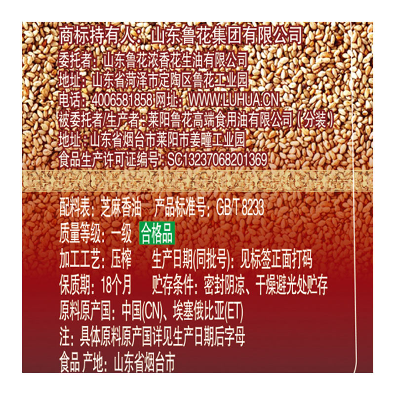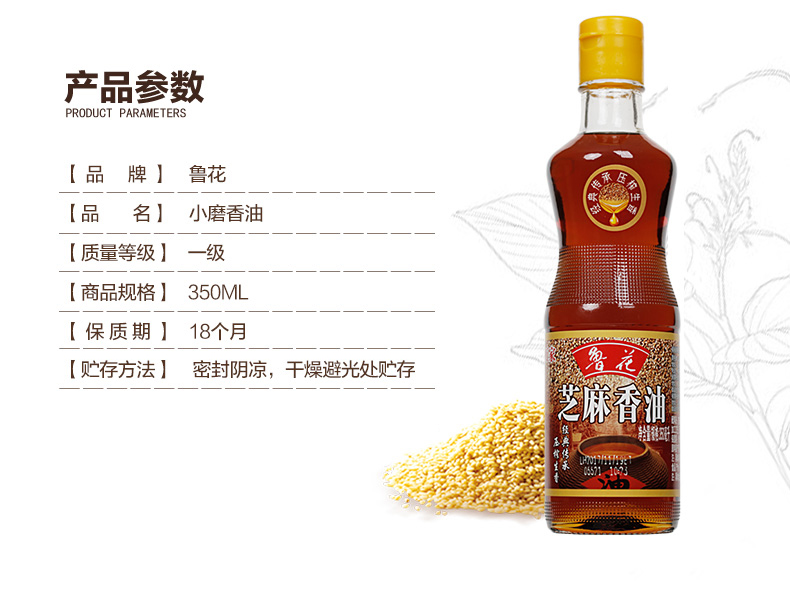 商品名称:鲁花 食用油 物理压榨 芝麻香油(凉拌 调味 烹饪 火锅) 350ml*2瓶 CP005071