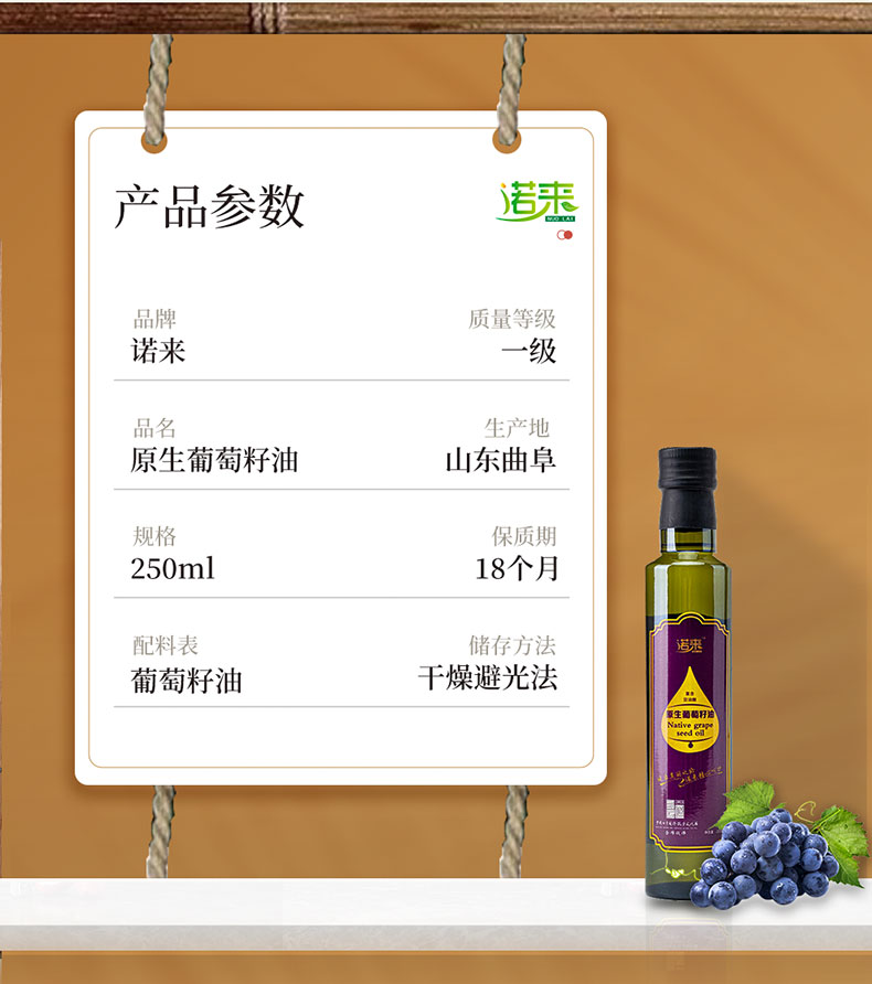 商品名称:诺来 一级冷榨原生葡萄籽油 250ml*2礼盒装(青海、新疆、西藏不发货)