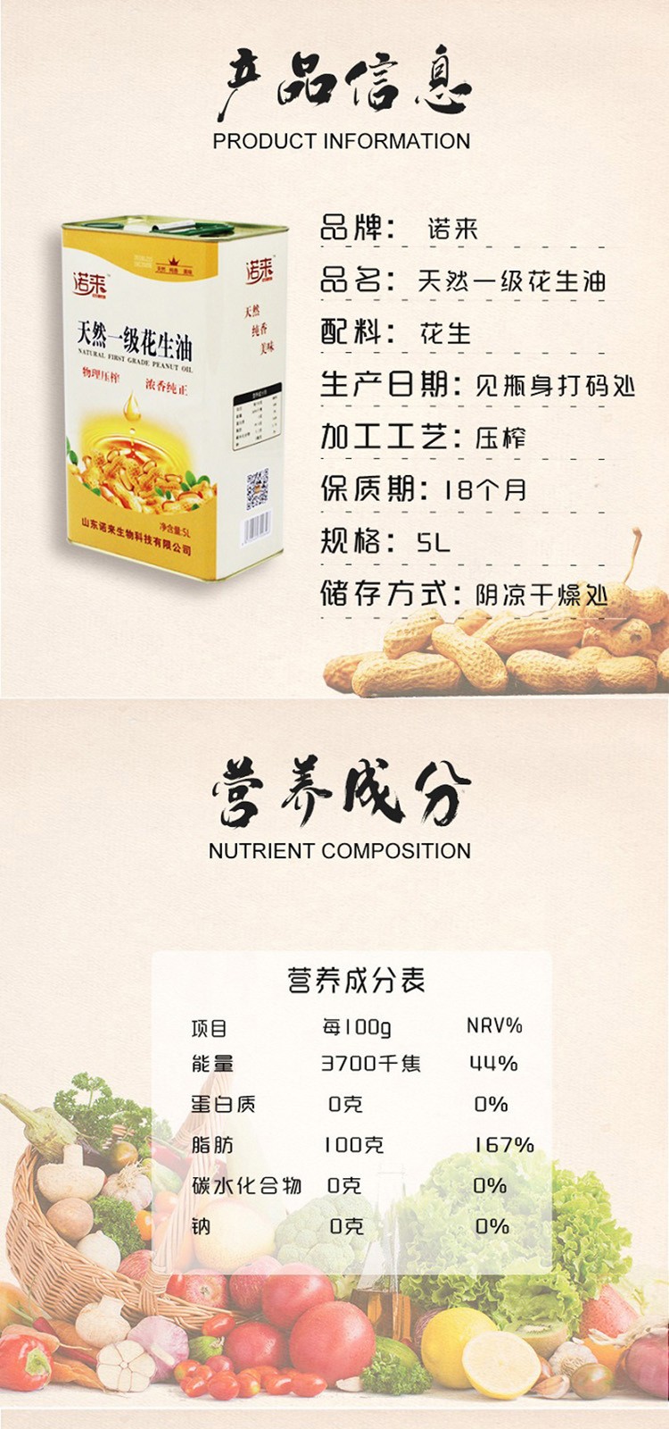 商品名称:诺来 一级冷榨花生油 5L铁罐装(青海、新疆、西藏不发货)