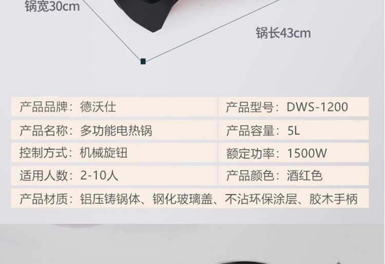 商品名称:德沃仕多功能电热锅5升大容量双发热管电煮锅电火锅 DWS-1200