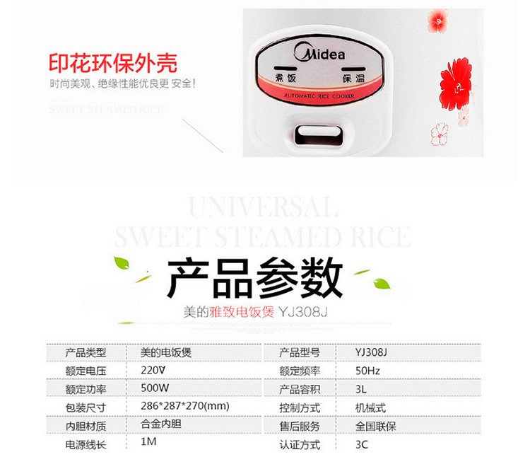 商品名称:美的 3L 机械式电饭煲 MB-YJ308J 小型不粘锅 白色 6939962728605