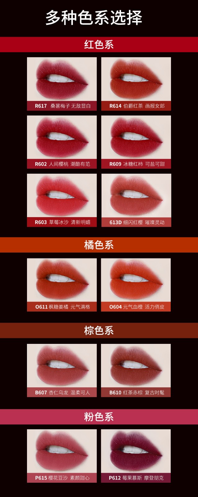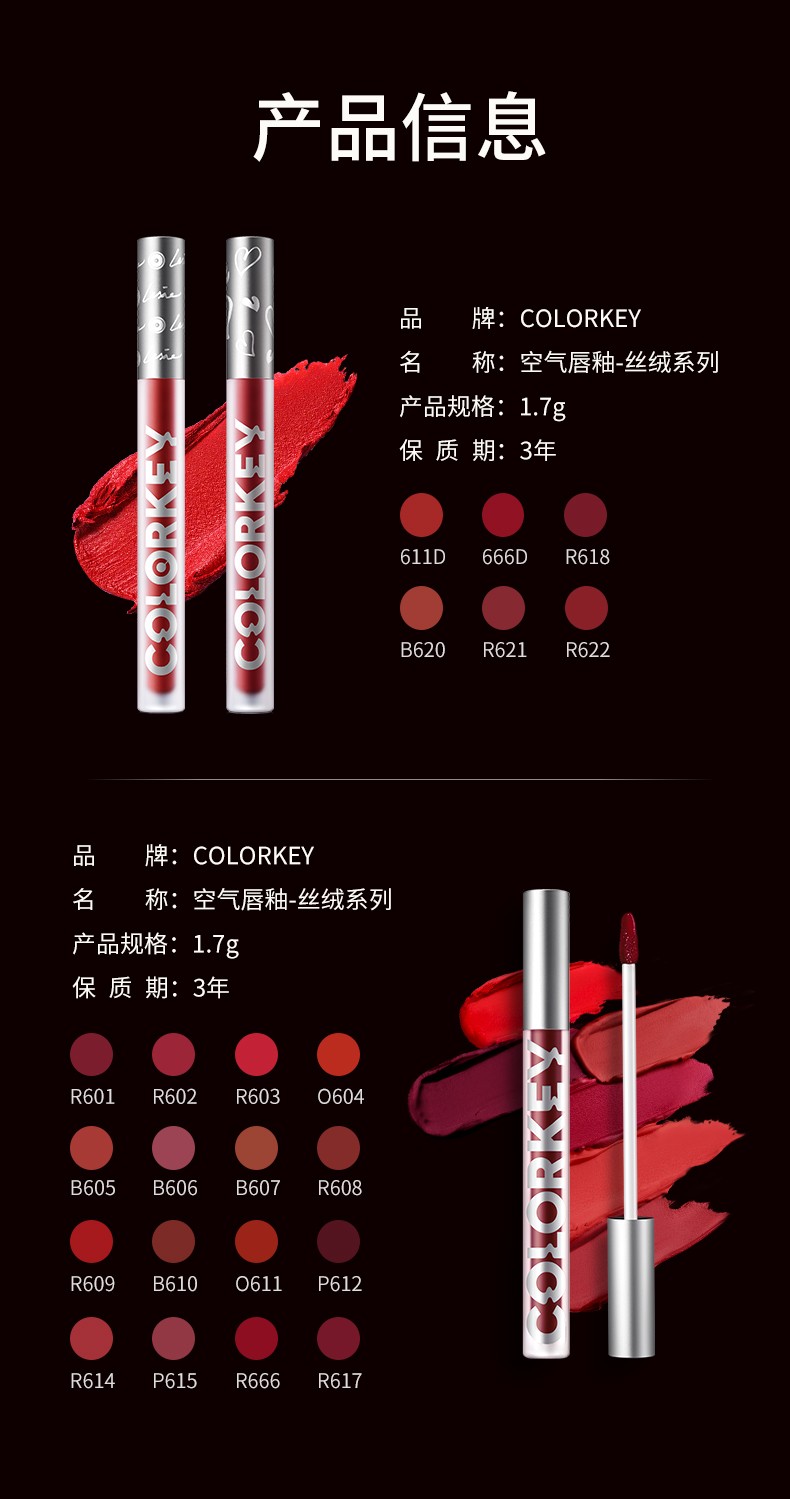 商品名称:colorkey珂拉琪空气唇釉(丝绒系列-哑光)雾面口红唇彩蜜持久显白R608/B605/O611/B620/R666/P208/R206/611D/666D/R601可选 下单备注色号