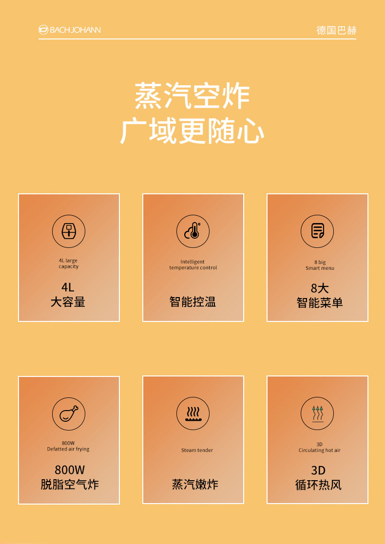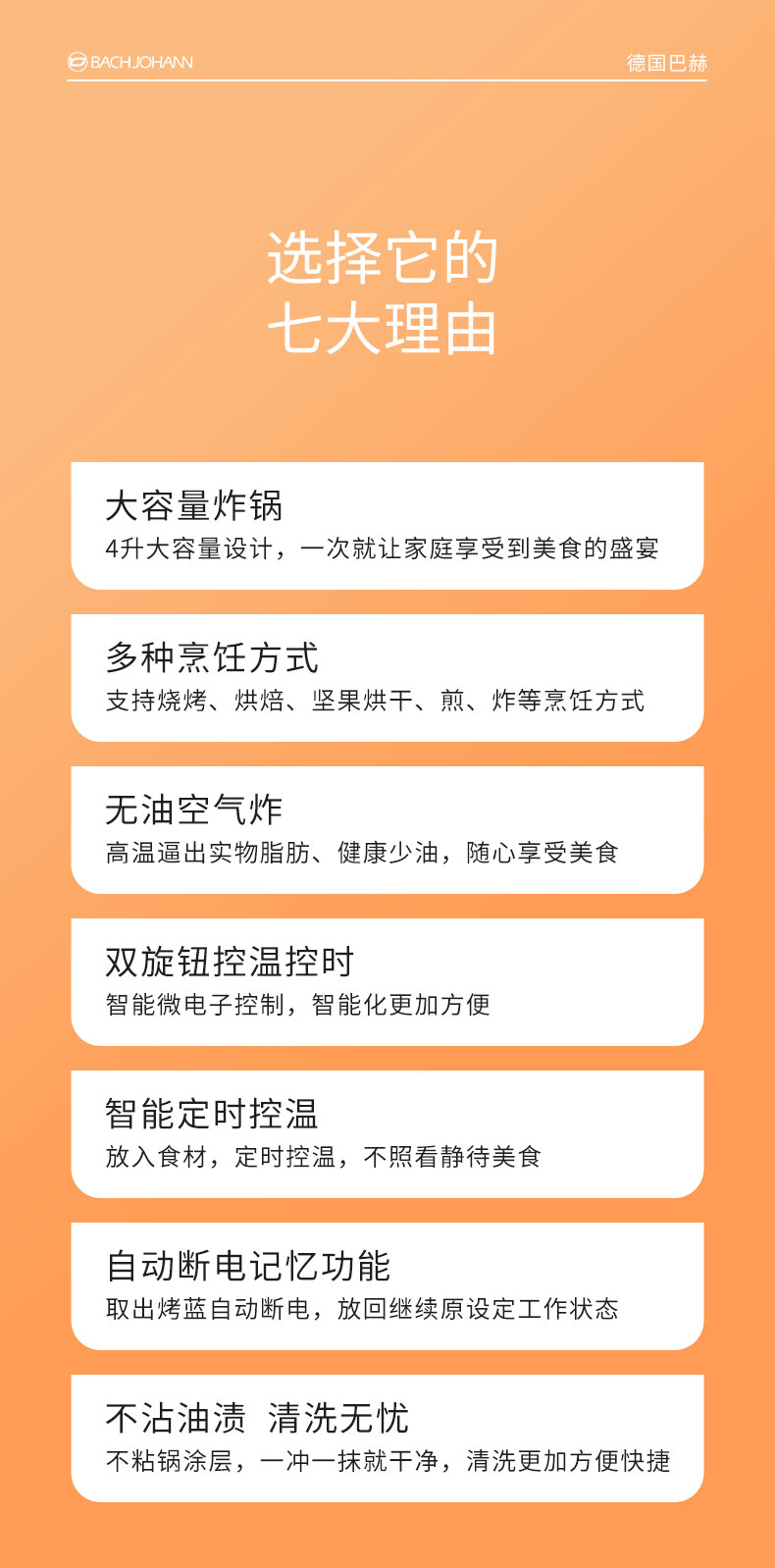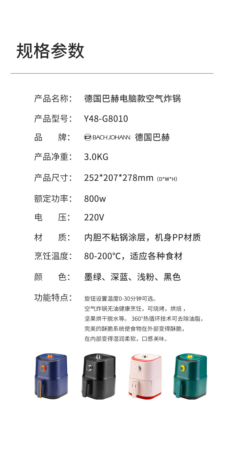 商品名称:BACHJOHANN德国巴赫 Y48-G8010空气炸锅 全自动智能无油电炸锅4L 绿/黑可选下单备注颜色