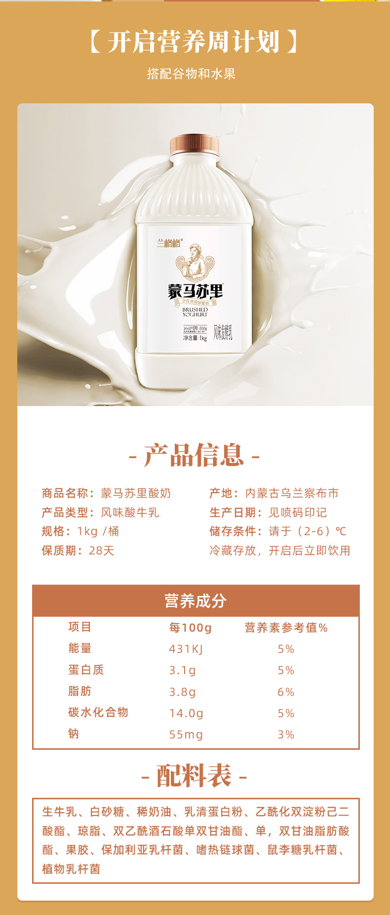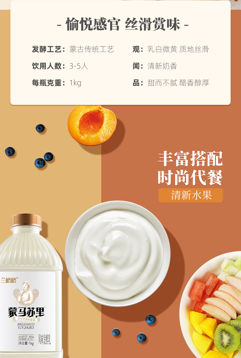 商品名称:兰格格 蒙马苏里 风味发酵乳 1kg*3瓶