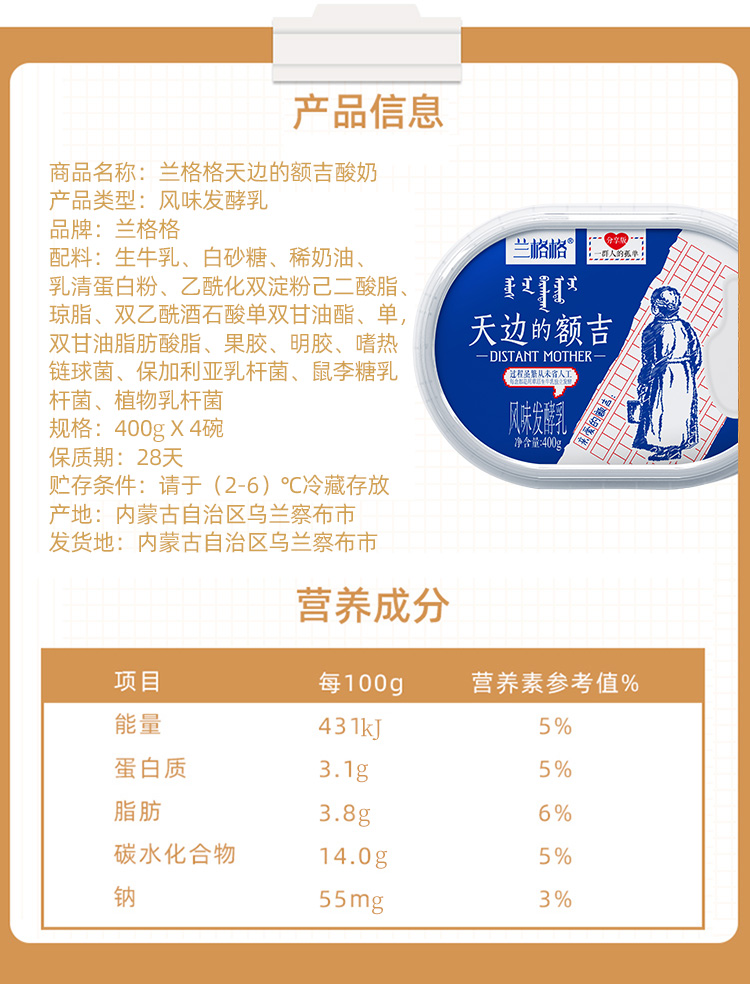 商品名称:兰格格 天边额吉酸奶 400g*4盒(加赠4袋谷物包)6932365571830