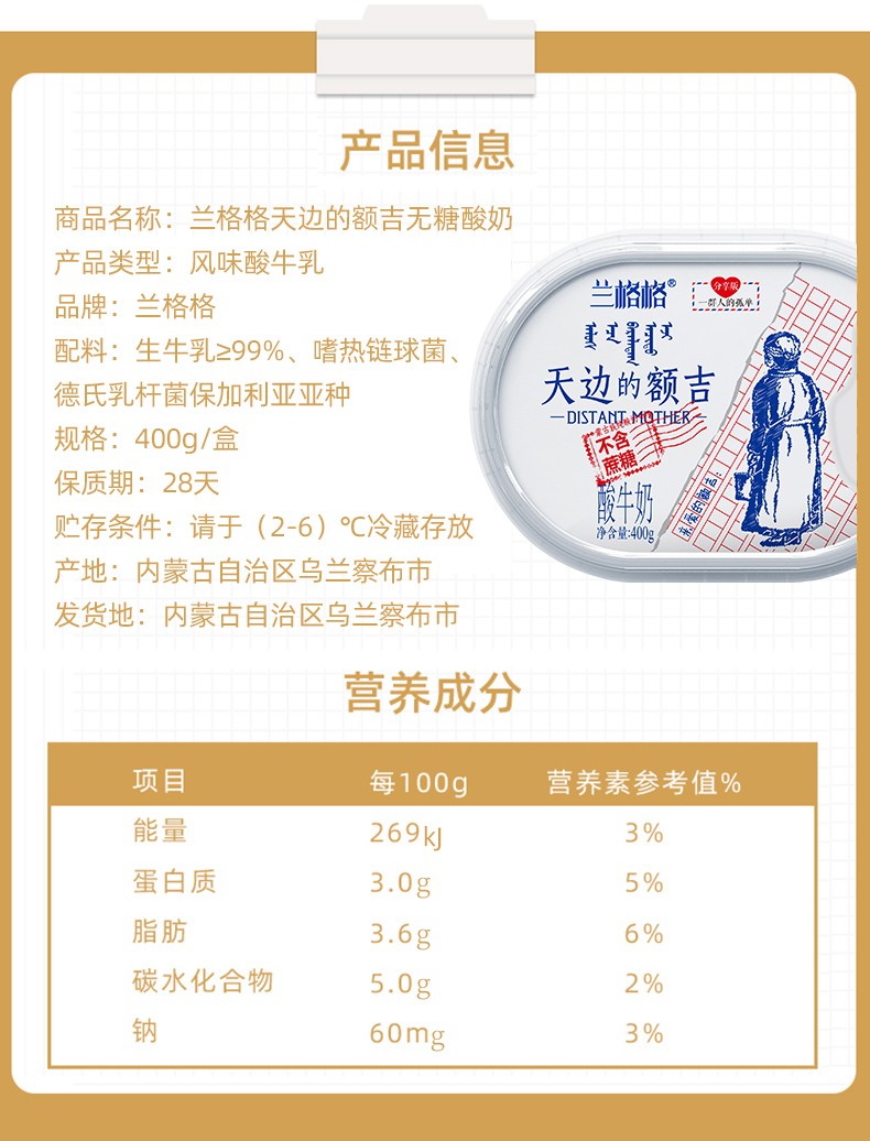 商品名称:兰格格 天边额吉0蔗糖400g*4盒 无糖酸奶 (加赠4袋谷物包+4包苜宿蜂蜜) 6932365573537