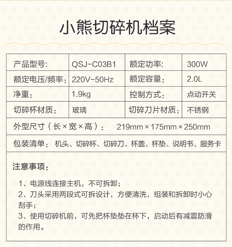 商品名称:小熊 切碎机 2L QSJ-C03B1 6940971219398
