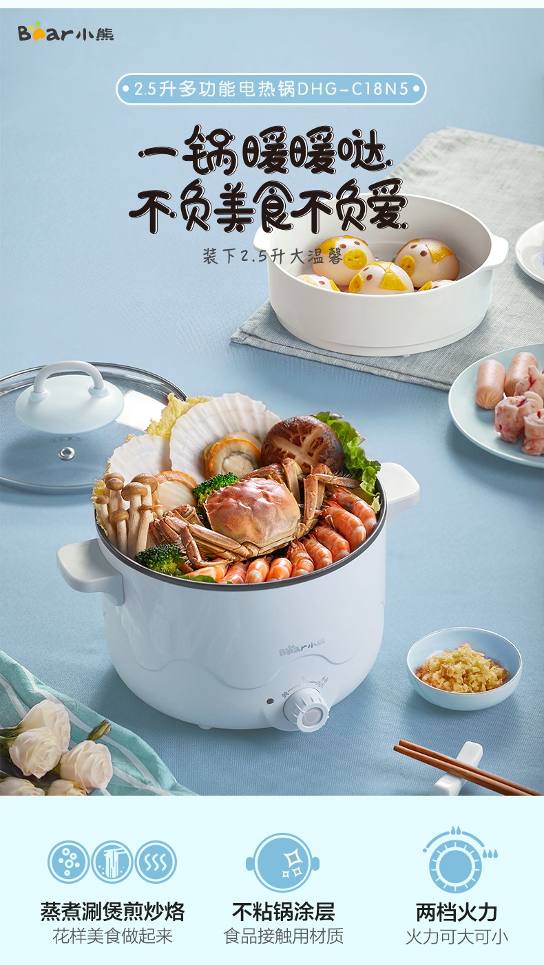 小熊 2.5L 电热锅 DRG-C18N5 多功能迷你电热锅带蒸笼 6940971219367