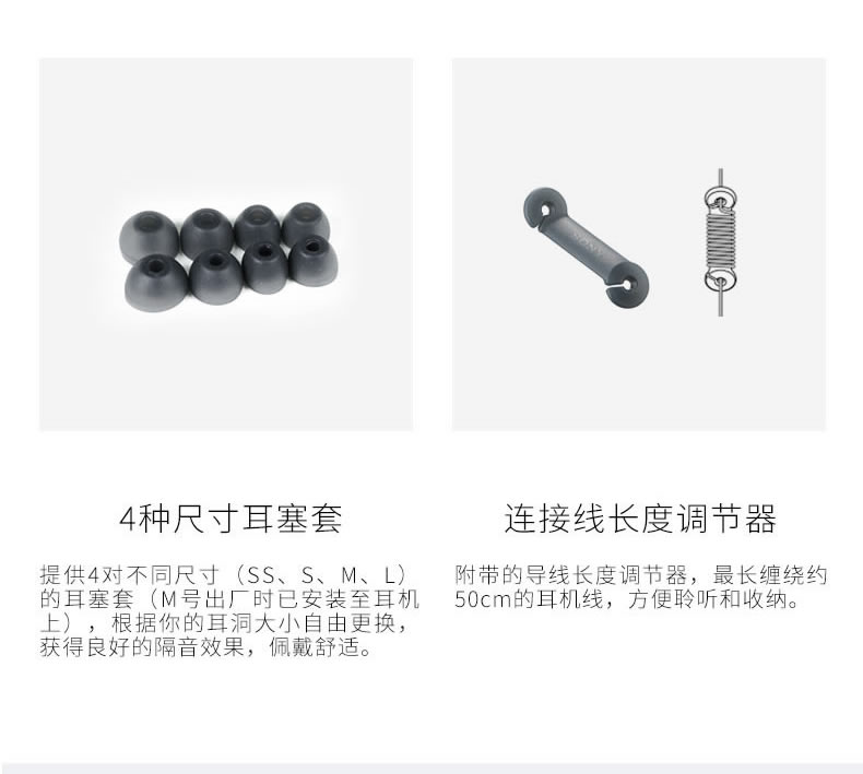 外包装 x1,L)x4,连接线长度调节器 x1,产品说明书 x1,保修卡 x1,立体声耳机 x1,耳塞(SS,S,M*出厂时安装至本耳机