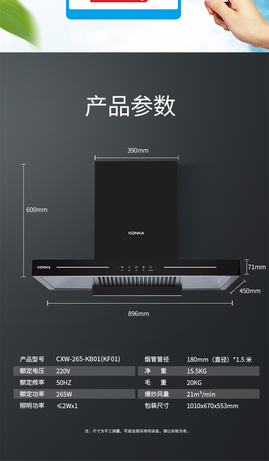 商品名称:康佳KONKA 吸油烟机CXW-265-KB01(KF01) 一键清洗 21立方 一级能效 手势控制 不含安装费 (西藏、新疆、青海、内蒙古、甘肃、宁夏、广西、黑龙江、吉林、辽宁、海南需补运费)