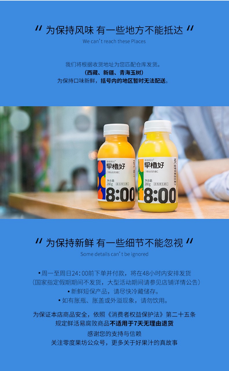 商品名称:零度果坊 早橙好 NFC非浓缩复原橙汁 280g*8瓶 6928126718699