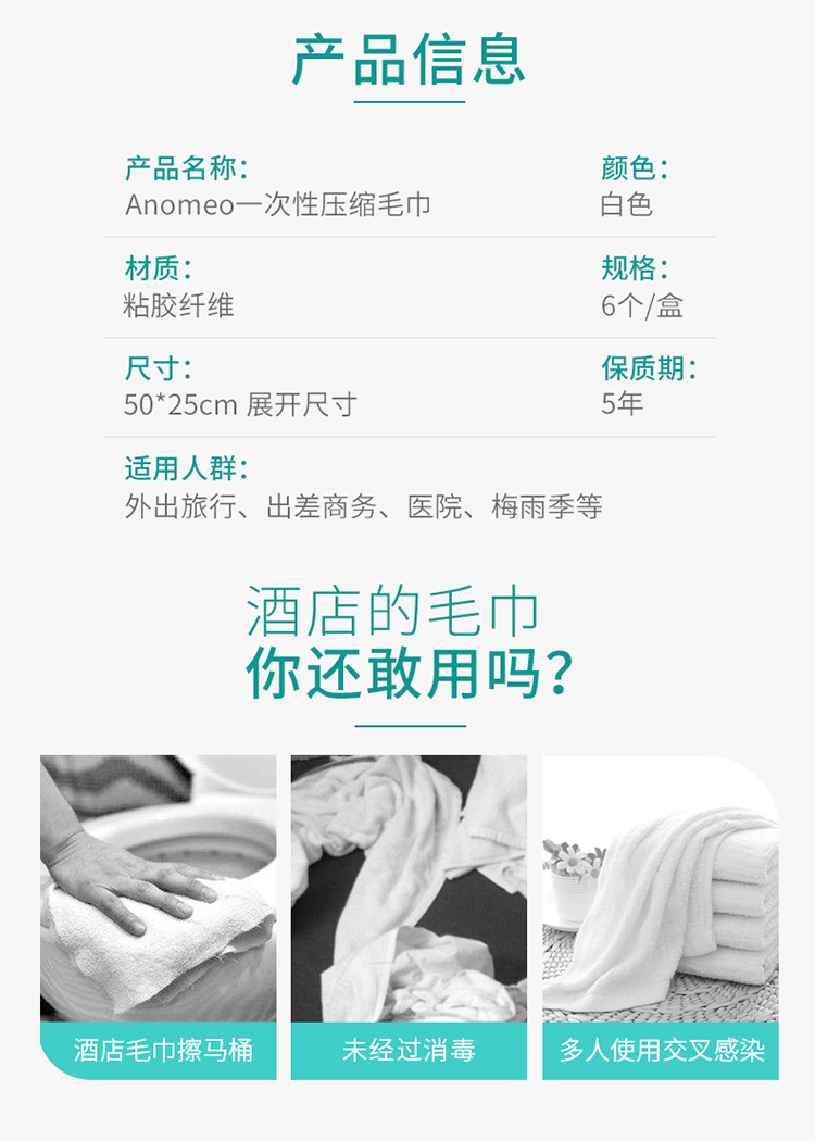 商品名称:艾那美Anomeo一次性压缩毛巾(6个)50x25x0.1cm 2457