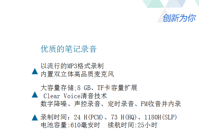 VTR5200/93 飞利浦录音笔 规格:充电式 锂聚合物以流行的MP3格式录制 内置双立体高品质麦克风