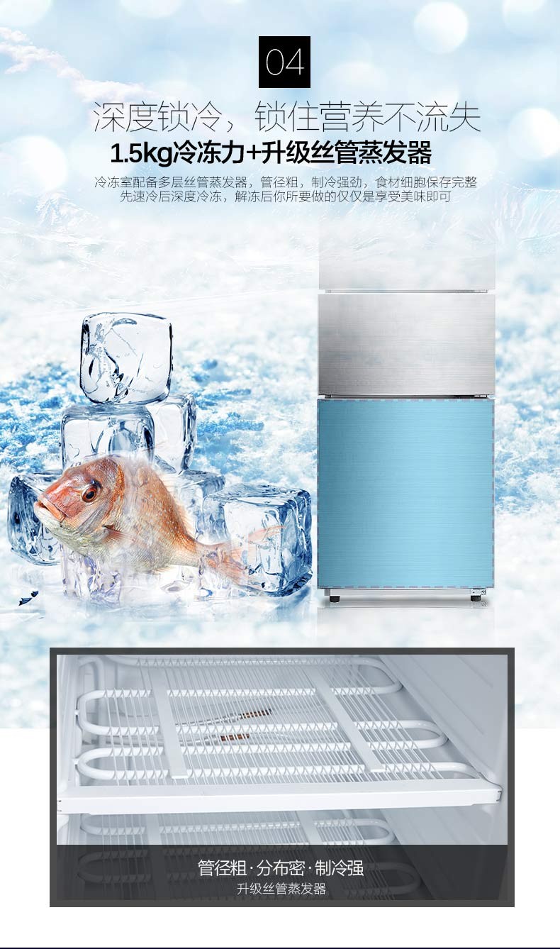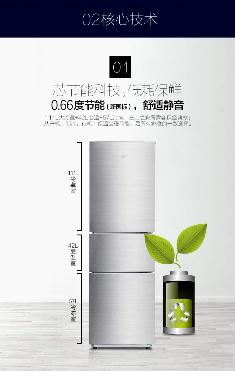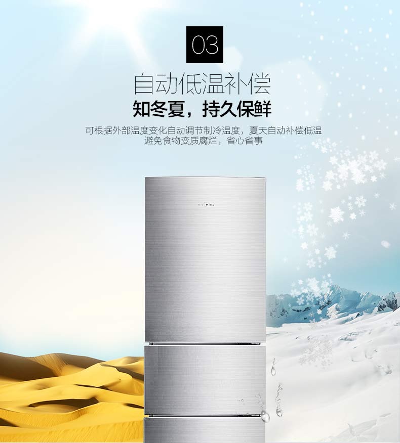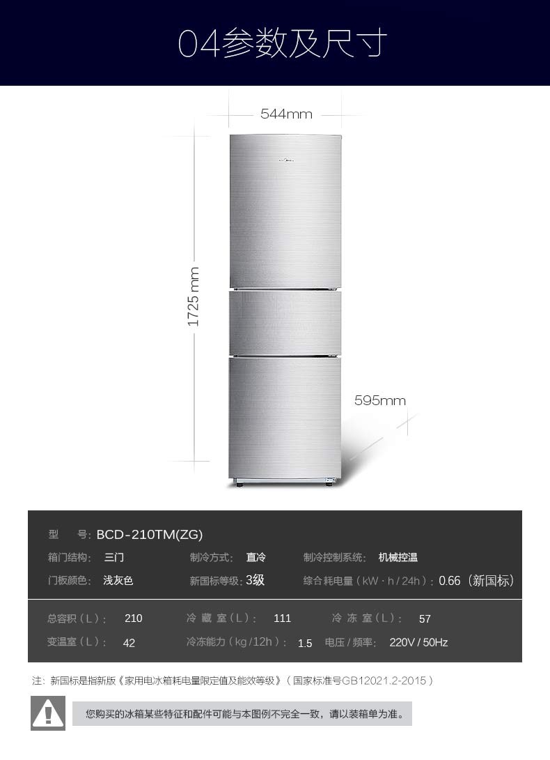 商品名称:美的/Midea 210L 节能静音三门三温区家用三门冰箱 浅灰BCD-210TM【ZG】
