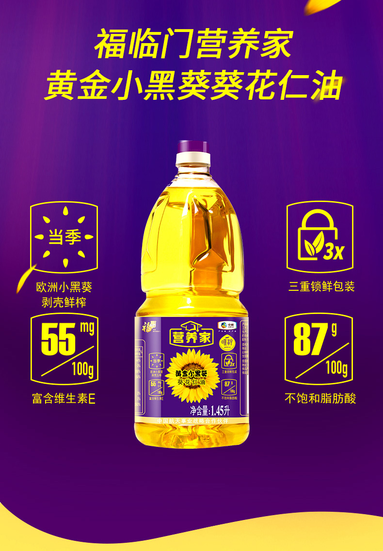 商品名称:中粮 福临门唯粹金典小黑葵葵花仁油 1.45L