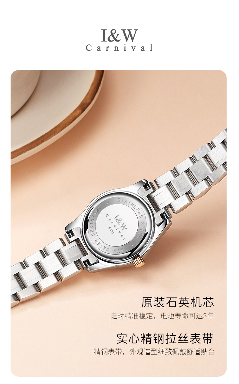 商品名称:爱沃驰 简约气质石英钢带女表8536 间玫钢带黑面